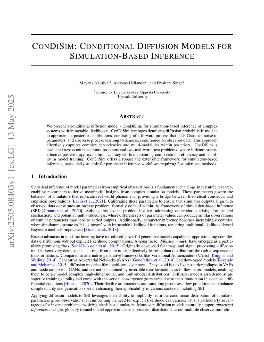 We present a conditional diffusion model - ConDiSim, for simulation-based inference of complex systems with intractable likelihoods. ConDiSim leverages denoising diffusion probabilistic models to approximate posterior distributions, consisting of a forward process that adds Gaussian noise to parameters, and a reverse process learning to denoise, conditioned on observed data. This approach effectively captures complex dependencies and multi-modalities within posteriors. ConDiSim is evaluated across ten benchmark problems and two real-world test problems, where it demonstrates effective posterior approximation accuracy while maintaining computational efficiency and stability in model training. ConDiSim offers a robust and extensible framework for simulation-based inference, particularly suitable for parameter inference workflows requiring fast inference methods.