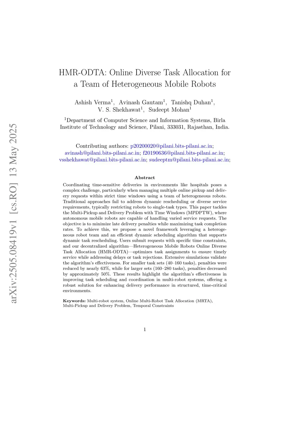 Coordinating time-sensitive deliveries in environments like hospitals poses a complex challenge, particularly when managing multiple online pickup and delivery requests within strict time windows using a team of heterogeneous robots. Traditional approaches fail to address dynamic rescheduling or diverse service requirements, typically restricting robots to single-task types. This paper tackles the Multi-Pickup and Delivery Problem with Time Windows (MPDPTW), where autonomous mobile robots are capable of handling varied service requests. The objective is to minimize late delivery penalties while maximizing task completion rates. To achieve this, we propose a novel framework leveraging a heterogeneous robot team and an efficient dynamic scheduling algorithm that supports dynamic task rescheduling. Users submit requests with specific time constraints, and our decentralized algorithm, Heterogeneous Mobile Robots Online Diverse Task Allocation (HMR-ODTA), optimizes task assignments to ensure timely service while addressing delays or task rejections. Extensive simulations validate the algorithm's effectiveness. For smaller task sets (40-160 tasks), penalties were reduced by nearly 63%, while for larger sets (160-280 tasks), penalties decreased by approximately 50%. These results highlight the algorithm's effectiveness in improving task scheduling and coordination in multi-robot systems, offering a robust solution for enhancing delivery performance in structured, time-critical environments.