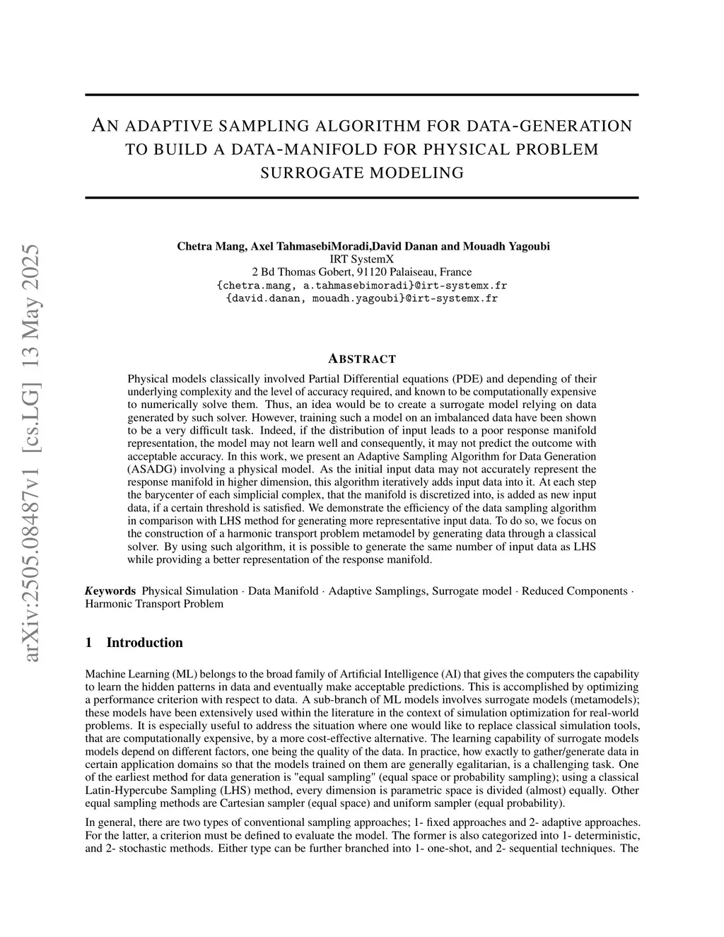 Physical models classically involved Partial Differential equations (PDE) and depending of their underlying complexity and the level of accuracy required, and known to be computationally expensive to numerically solve them. Thus, an idea would be to create a surrogate model relying on data generated by such solver. However, training such a model on an imbalanced data have been shown to be a very difficult task. Indeed, if the distribution of input leads to a poor response manifold representation, the model may not learn well and consequently, it may not predict the outcome with acceptable accuracy. In this work, we present an Adaptive Sampling Algorithm for Data Generation (ASADG) involving a physical model. As the initial input data may not accurately represent the response manifold in higher dimension, this algorithm iteratively adds input data into it. At each step the barycenter of each simplicial complex, that the manifold is discretized into, is added as new input data, if a certain threshold is satisfied. We demonstrate the efficiency of the data sampling algorithm in comparison with LHS method for generating more representative input data. To do so, we focus on the construction of a harmonic transport problem metamodel by generating data through a classical solver. By using such algorithm, it is possible to generate the same number of input data as LHS while providing a better representation of the response manifold.