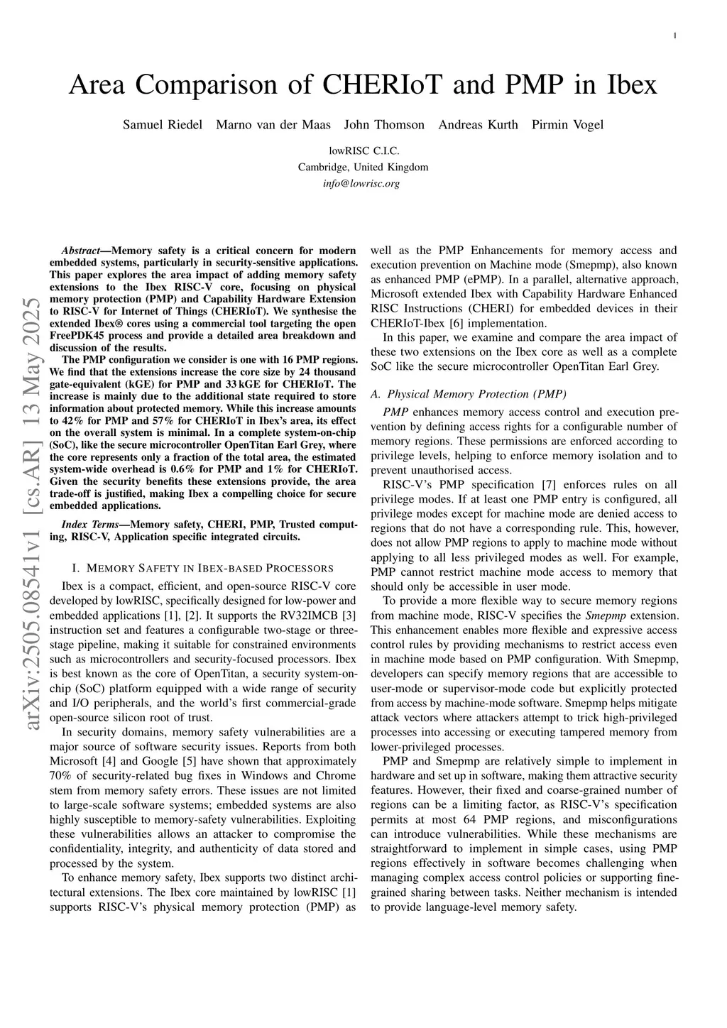 Memory safety is a critical concern for modern embedded systems, particularly in security-sensitive applications. This paper explores the area impact of adding memory safety extensions to the Ibex RISC-V core, focusing on physical memory protection (PMP) and Capability Hardware Extension to RISC-V for Internet of Things (CHERIoT). We synthesise the extended Ibex cores using a commercial tool targeting the open FreePDK45 process and provide a detailed area breakdown and discussion of the results.The PMP configuration we consider is one with 16 PMP regions. We find that the extensions increase the core size by 24 thousand gate-equivalent (kGE) for PMP and 33 kGE for CHERIoT. The increase is mainly due to the additional state required to store information about protected memory. While this increase amounts to 42% for PMP and 57% for CHERIoT in Ibex's area, its effect on the overall system is minimal. In a complete system-on-chip (SoC), like the secure microcontroller OpenTitan Earl Grey, where the core represents only a fraction of the total area, the estimated system-wide overhead is 0.6% for PMP and 1% for CHERIoT. Given the security benefits these extensions provide, the area trade-off is justified, making Ibex a compelling choice for secure embedded applications.
