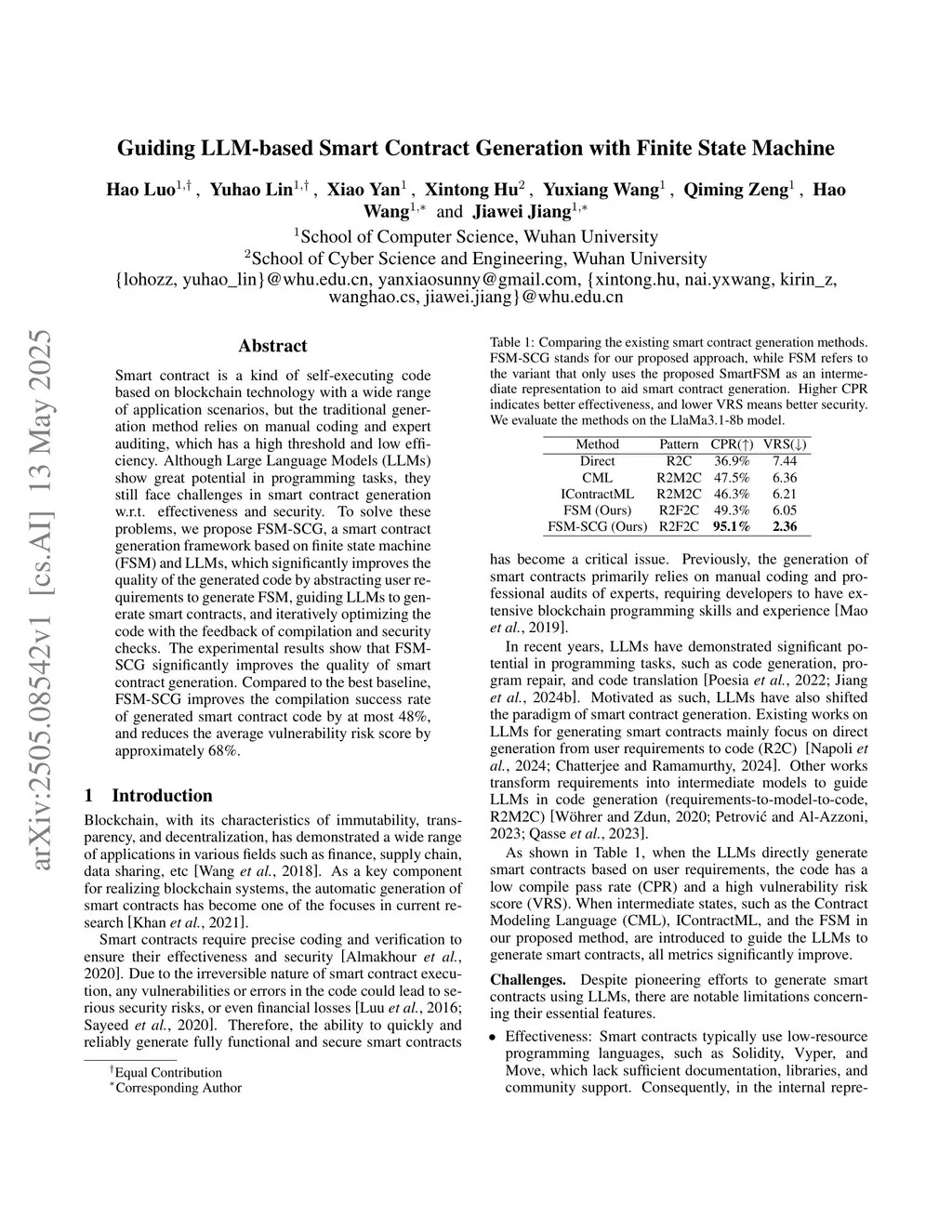 Smart contract is a kind of self-executing code based on blockchain technology with a wide range of application scenarios, but the traditional generation method relies on manual coding and expert auditing, which has a high threshold and low efficiency. Although Large Language Models (LLMs) show great potential in programming tasks, they still face challenges in smart contract generation w.r.t. effectiveness and security. To solve these problems, we propose FSM-SCG, a smart contract generation framework based on finite state machine (FSM) and LLMs, which significantly improves the quality of the generated code by abstracting user requirements to generate FSM, guiding LLMs to generate smart contracts, and iteratively optimizing the code with the feedback of compilation and security checks. The experimental results show that FSM-SCG significantly improves the quality of smart contract generation. Compared to the best baseline, FSM-SCG improves the compilation success rate of generated smart contract code by at most 48%, and reduces the average vulnerability risk score by approximately 68%.