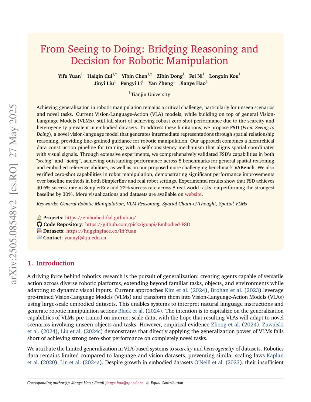 Achieving generalization in robotic manipulation remains a critical challenge, particularly for unseen scenarios and novel tasks. Current Vision-Language-Action (VLA) models, while building on top of general Vision-Language Models (VLMs), still fall short of achieving robust zero-shot performance due to the scarcity and heterogeneity prevalent in embodied datasets. To address these limitations, we propose FSD (From Seeing to Doing), a novel vision-language model that generates intermediate representations through spatial relationship reasoning, providing fine-grained guidance for robotic manipulation. Our approach combines a hierarchical data pipeline for training with a self-consistency mechanism that aligns spatial coordinates with visual signals. Through extensive experiments, we comprehensively validated FSD's capabilities in both "seeing" and "doing," achieving outstanding performance across 8 benchmarks for general spatial reasoning and embodied reference abilities, as well as on our proposed more challenging benchmark VABench. We also verified zero-shot capabilities in robot manipulation, demonstrating significant performance improvements over baseline methods in both SimplerEnv and real robot settings. Experimental results show that FSD achieves 40.6% success rate in SimplerEnv and 72% success rate across 8 real-world tasks, outperforming the strongest baseline by 30%.