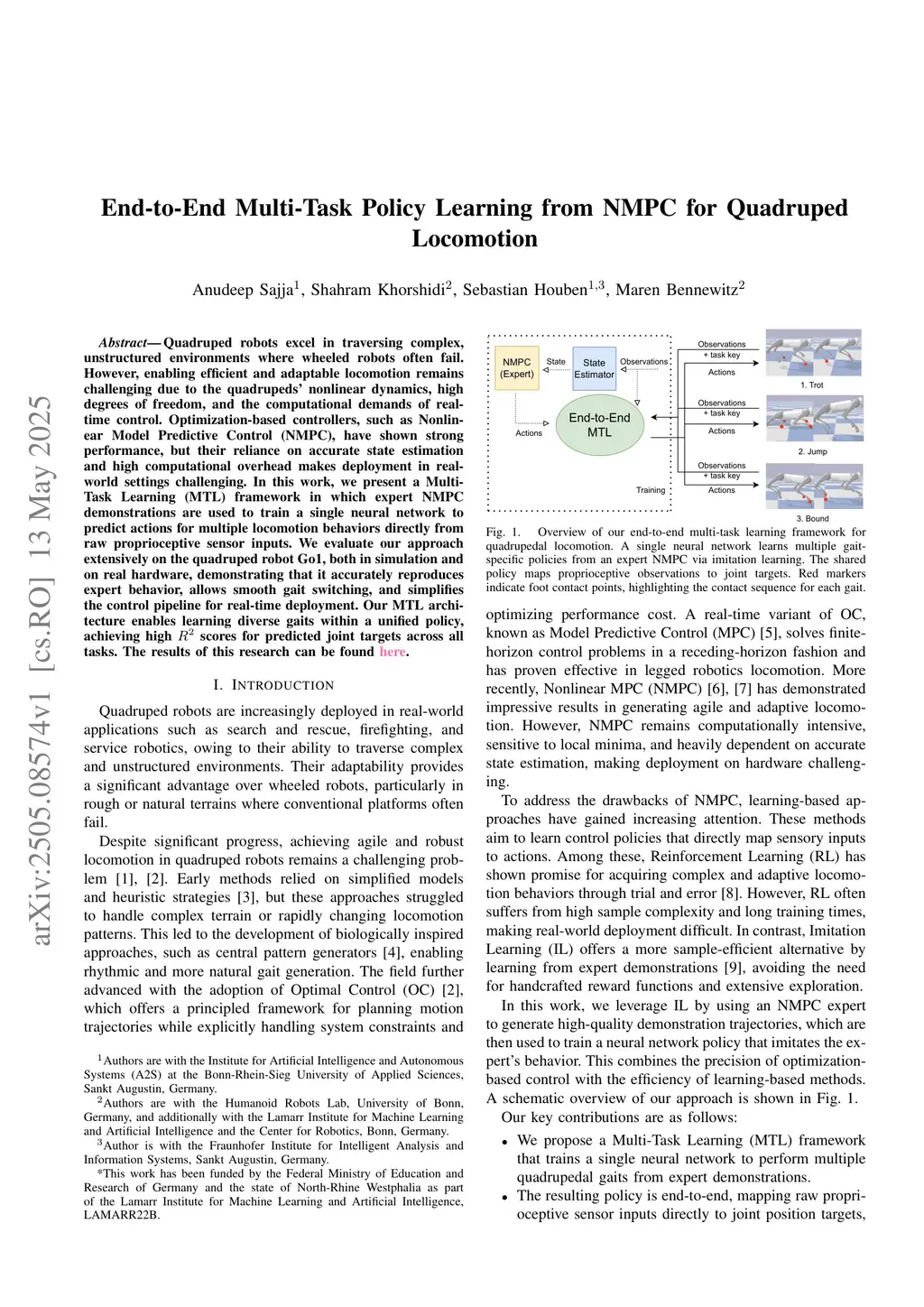 Quadruped robots excel in traversing complex, unstructured environments where wheeled robots often fail. However, enabling efficient and adaptable locomotion remains challenging due to the quadrupeds' nonlinear dynamics, high degrees of freedom, and the computational demands of real-time control. Optimization-based controllers, such as Nonlinear Model Predictive Control (NMPC), have shown strong performance, but their reliance on accurate state estimation and high computational overhead makes deployment in real-world settings challenging. In this work, we present a Multi-Task Learning (MTL) framework in which expert NMPC demonstrations are used to train a single neural network to predict actions for multiple locomotion behaviors directly from raw proprioceptive sensor inputs. We evaluate our approach extensively on the quadruped robot Go1, both in simulation and on real hardware, demonstrating that it accurately reproduces expert behavior, allows smooth gait switching, and simplifies the control pipeline for real-time deployment. Our MTL architecture enables learning diverse gaits within a unified policy, achieving high scores for predicted joint targets across all tasks.
