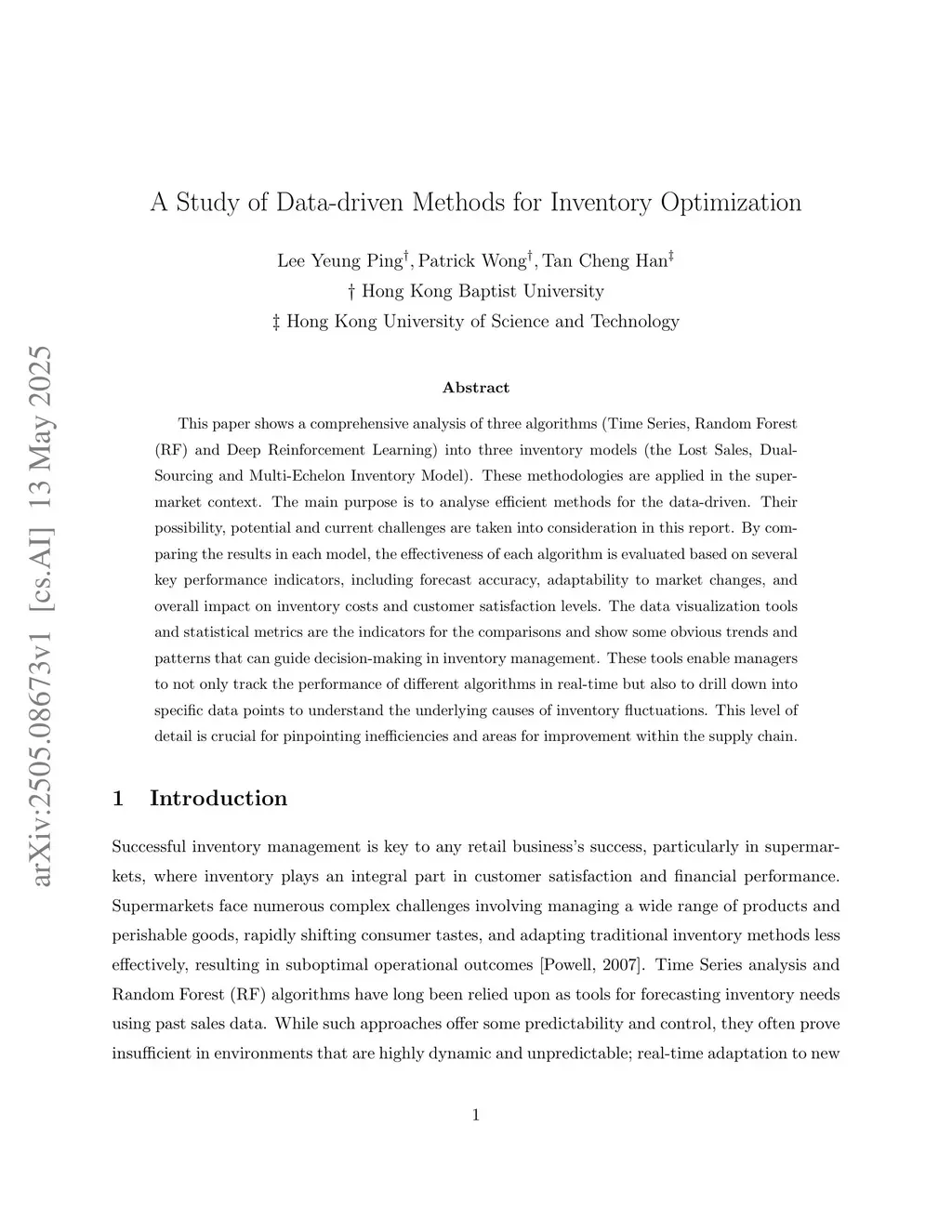 This paper shows a comprehensive analysis of three algorithms (Time Series, Random Forest (RF) and Deep Reinforcement Learning) into three inventory models (the Lost Sales, Dual-Sourcing and Multi-Echelon Inventory Model). These methodologies are applied in the supermarket context. The main purpose is to analyse efficient methods for the data-driven. Their possibility, potential and current challenges are taken into consideration in this report. By comparing the results in each model, the effectiveness of each algorithm is evaluated based on several key performance indicators, including forecast accuracy, adaptability to market changes, and overall impact on inventory costs and customer satisfaction levels. The data visualization tools and statistical metrics are the indicators for the comparisons and show some obvious trends and patterns that can guide decision-making in inventory management. These tools enable managers to not only track the performance of different algorithms in real-time but also to drill down into specific data points to understand the underlying causes of inventory fluctuations. This level of detail is crucial for pinpointing inefficiencies and areas for improvement within the supply chain.