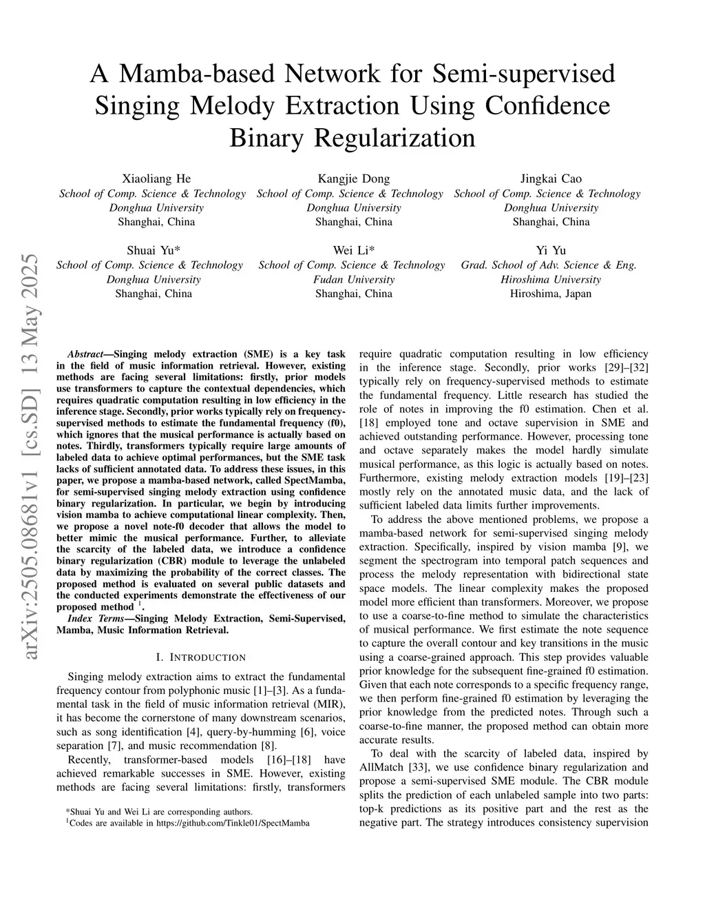 A Mamba-based Network for Semi-supervised Singing Melody Extraction Using Confidence Binary Regularization