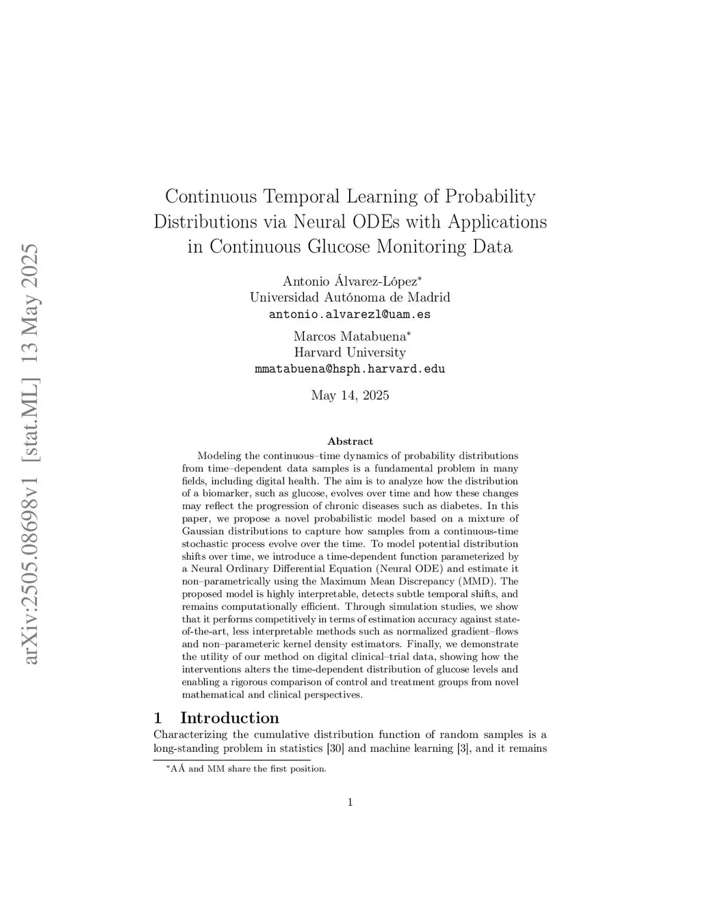 Modeling the dynamics of probability distributions from time-dependent data samples is a fundamental problem in many fields, including digital health. The goal is to analyze how the distribution of a biomarker, such as glucose, changes over time and how these changes may reflect the progression of chronic diseases such as diabetes. We introduce a probabilistic model based on a Gaussian mixture that captures the evolution of a continuous-time stochastic process. Our approach combines a nonparametric estimate of the distribution, obtained with Maximum Mean Discrepancy (MMD), and a Neural Ordinary Differential Equation (Neural ODE) that governs the temporal evolution of the mixture weights. The model is highly interpretable, detects subtle distribution shifts, and remains computationally efficient. We illustrate the broad utility of our approach in a 26-week clinical trial that treats all continuous glucose monitoring (CGM) time series as the primary outcome. This method enables rigorous longitudinal comparisons between the treatment and control arms and yields characterizations that conventional summary-based clinical trials analytical methods typically do not capture.