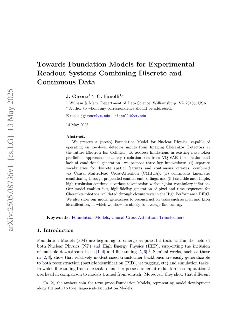 We present a (proto) Foundation Model for Nuclear Physics, capable of operating on low-level detector inputs from Imaging Cherenkov Detectors at the future Electron Ion Collider. Building upon established next-token prediction approaches, we aim to address potential challenges such as resolution loss from existing tokenization schemes and limited support for conditional generation. We propose four key innovations: (i) separate vocabularies for discrete and continuous variates, combined via Causal Multi-Head Cross-Attention (CMHCA), (ii) continuous kinematic conditioning through prepended context embeddings, (iii) scalable and simple, high-resolution continuous variate tokenization without joint vocabulary inflation, and (iv) class conditional generation through a Mixture of Experts. Our model enables fast, high-fidelity generation of pixel and time sequences for Cherenkov photons, validated through closure tests in the High Performance DIRC. We also show our model generalizes to reconstruction tasks such as pion/kaon identification, and noise filtering, in which we show its ability to leverage fine-tuning under specific objectives.