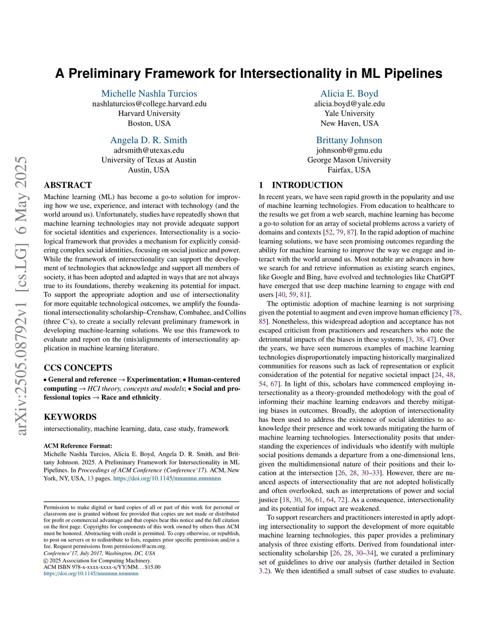 Machine learning (ML) has become a go-to solution for improving how we use, experience, and interact with technology (and the world around us). Unfortunately, studies have repeatedly shown that machine learning technologies may not provide adequate support for societal identities and experiences. Intersectionality is a sociological framework that provides a mechanism for explicitly considering complex social identities, focusing on social justice and power. While the framework of intersectionality can support the development of technologies that acknowledge and support all members of society, it has been adopted and adapted in ways that are not always true to its foundations, thereby weakening its potential for impact. To support the appropriate adoption and use of intersectionality for more equitable technological outcomes, we amplify the foundational intersectionality scholarship--Crenshaw, Combahee, and Collins (three C's), to create a socially relevant preliminary framework in developing machine-learning solutions. We use this framework to evaluate and report on the (mis)alignments of intersectionality application in machine learning literature.