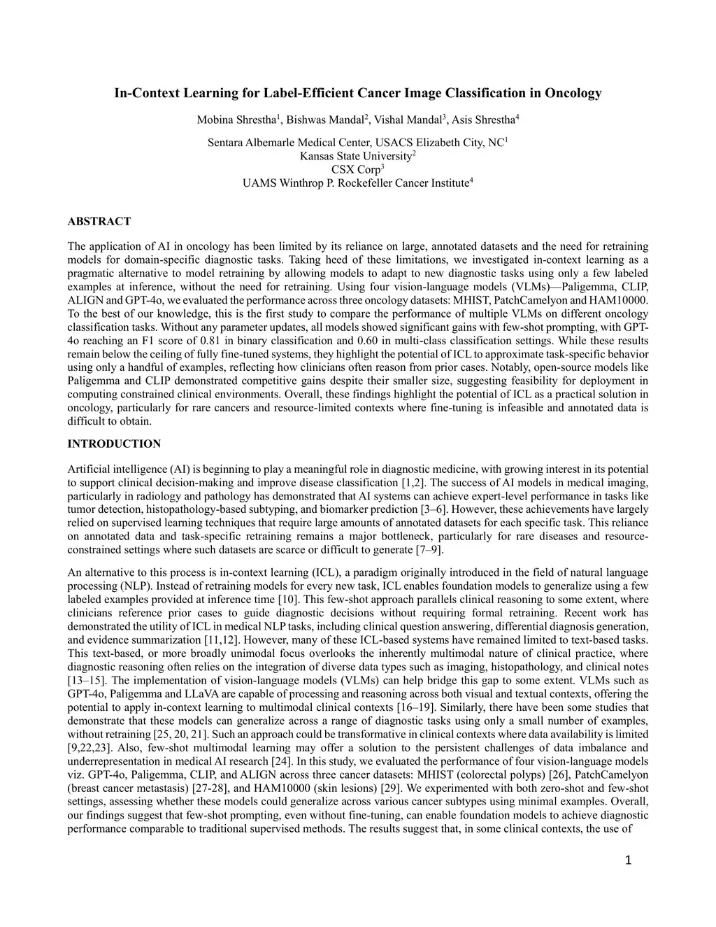 The application of AI in oncology has been limited by its reliance on large, annotated datasets and the need for retraining models for domain-specific diagnostic tasks. Taking heed of these limitations, we investigated in-context learning as a pragmatic alternative to model retraining by allowing models to adapt to new diagnostic tasks using only a few labeled examples at inference, without the need for retraining. Using four vision-language models (VLMs)-Paligemma, CLIP, ALIGN and GPT-4o, we evaluated the performance across three oncology datasets: MHIST, PatchCamelyon and HAM10000. To the best of our knowledge, this is the first study to compare the performance of multiple VLMs on different oncology classification tasks. Without any parameter updates, all models showed significant gains with few-shot prompting, with GPT-4o reaching an F1 score of 0.81 in binary classification and 0.60 in multi-class classification settings. While these results remain below the ceiling of fully fine-tuned systems, they highlight the potential of ICL to approximate task-specific behavior using only a handful of examples, reflecting how clinicians often reason from prior cases. Notably, open-source models like Paligemma and CLIP demonstrated competitive gains despite their smaller size, suggesting feasibility for deployment in computing constrained clinical environments. Overall, these findings highlight the potential of ICL as a practical solution in oncology, particularly for rare cancers and resource-limited contexts where fine-tuning is infeasible and annotated data is difficult to obtain.