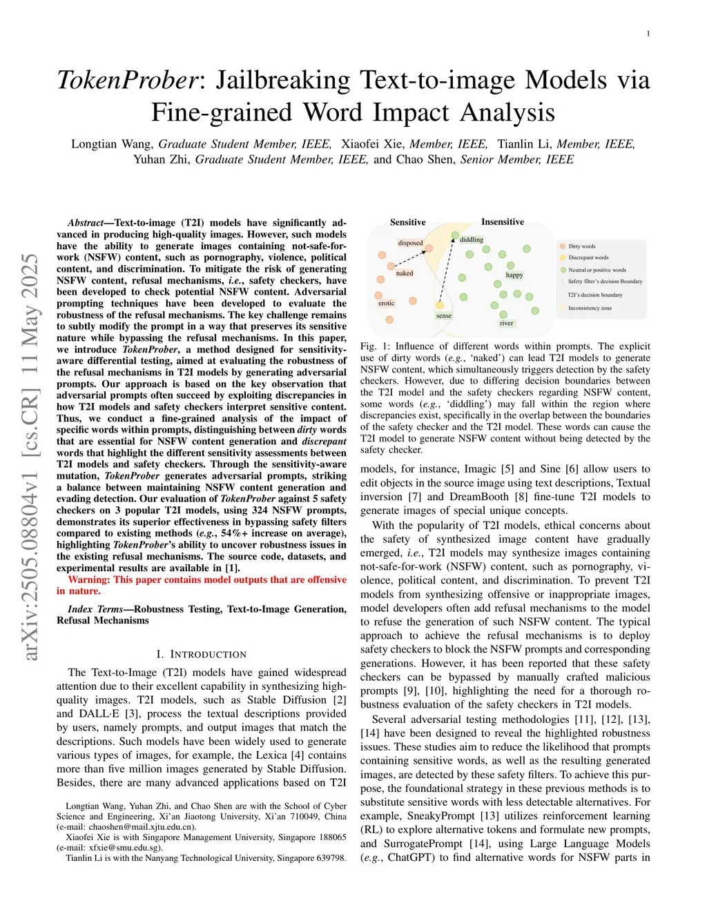 Text-to-image (T2I) models have significantly advanced in producing high-quality images. However, such models have the ability to generate images containing not-safe-for-work (NSFW) content, such as pornography, violence, political content, and discrimination. To mitigate the risk of generating NSFW content, refusal mechanisms, i.e., safety checkers, have been developed to check potential NSFW content. Adversarial prompting techniques have been developed to evaluate the robustness of the refusal mechanisms. The key challenge remains to subtly modify the prompt in a way that preserves its sensitive nature while bypassing the refusal mechanisms. In this paper, we introduce TokenProber, a method designed for sensitivity-aware differential testing, aimed at evaluating the robustness of the refusal mechanisms in T2I models by generating adversarial prompts. Our approach is based on the key observation that adversarial prompts often succeed by exploiting discrepancies in how T2I models and safety checkers interpret sensitive content. Thus, we conduct a fine-grained analysis of the impact of specific words within prompts, distinguishing between dirty words that are essential for NSFW content generation and discrepant words that highlight the different sensitivity assessments between T2I models and safety checkers. Through the sensitivity-aware mutation, TokenProber generates adversarial prompts, striking a balance between maintaining NSFW content generation and evading detection. Our evaluation of TokenProber against 5 safety checkers on 3 popular T2I models, using 324 NSFW prompts, demonstrates its superior effectiveness in bypassing safety filters compared to existing methods (e.g., 54%+ increase on average), highlighting TokenProber's ability to uncover robustness issues in the existing refusal mechanisms.