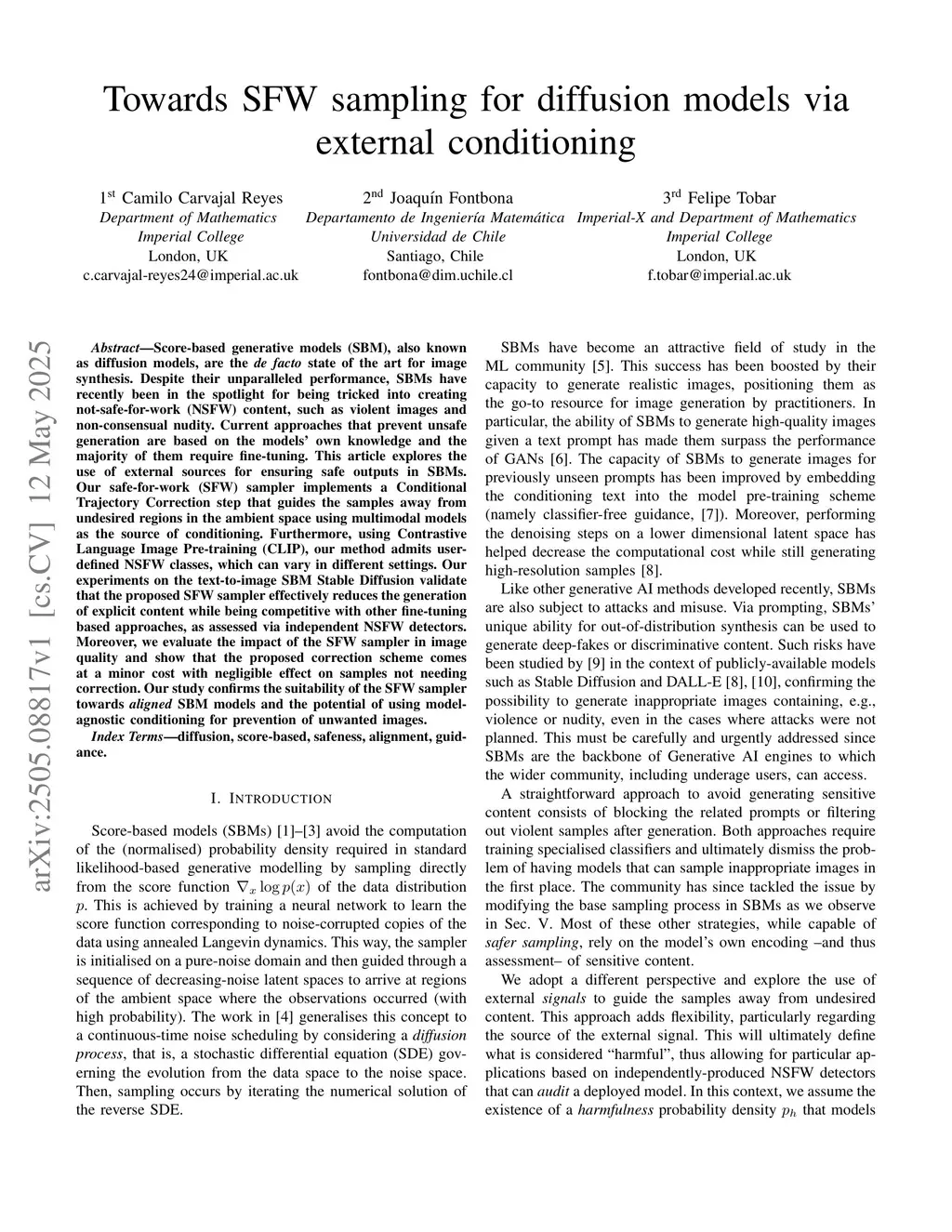 Towards SFW sampling for diffusion models via external conditioning