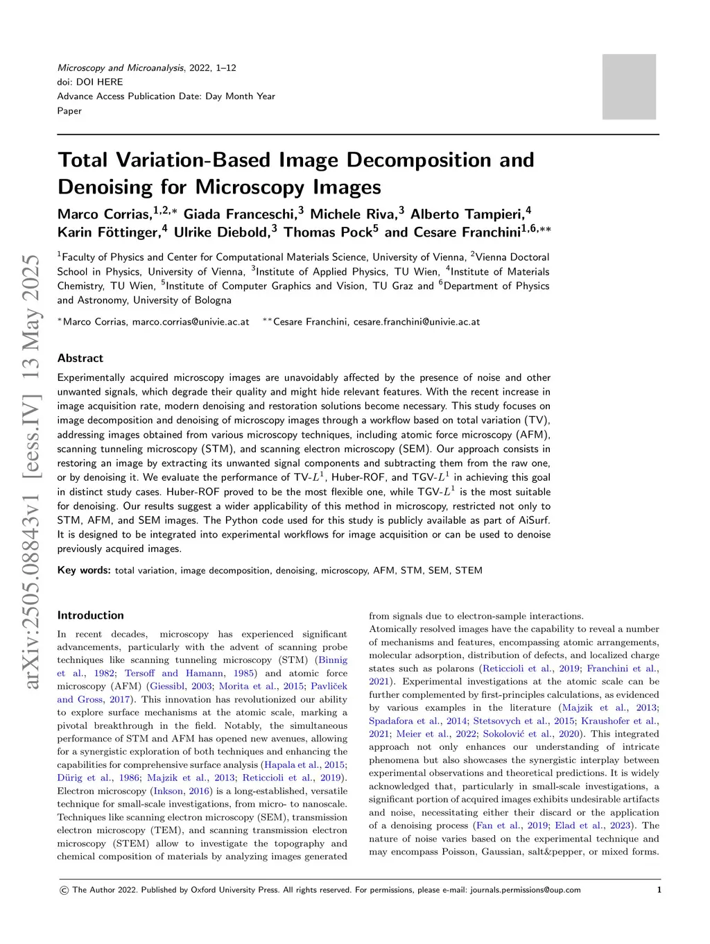 Experimentally acquired microscopy images are unavoidably affected by the presence of noise and other unwanted signals, which degrade their quality and might hide relevant features. With the recent increase in image acquisition rate, modern denoising and restoration solutions become necessary. This study focuses on image decomposition and denoising of microscopy images through a workflow based on total variation (TV), addressing images obtained from various microscopy techniques, including atomic force microscopy (AFM), scanning tunneling microscopy (STM), and scanning electron microscopy (SEM). Our approach consists in restoring an image by extracting its unwanted signal components and subtracting them from the raw one, or by denoising it. We evaluate the performance of TV-, Huber-ROF, and TGV- in achieving this goal in distinct study cases. Huber-ROF proved to be the most flexible one, while TGV- is the most suitable for denoising. Our results suggest a wider applicability of this method in microscopy, restricted not only to STM, AFM, and SEM images. The Python code used for this study is publicly available as part of AiSurf. It is designed to be integrated into experimental workflows for image acquisition or can be used to denoise previously acquired images.