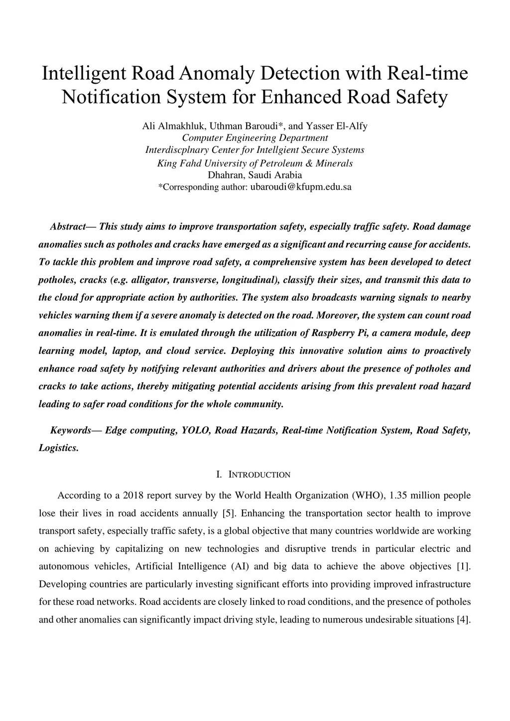This study aims to improve transportation safety, especially traffic safety. Road damage anomalies such as potholes and cracks have emerged as a significant and recurring cause for accidents. To tackle this problem and improve road safety, a comprehensive system has been developed to detect potholes, cracks (e.g. alligator, transverse, longitudinal), classify their sizes, and transmit this data to the cloud for appropriate action by authorities. The system also broadcasts warning signals to nearby vehicles warning them if a severe anomaly is detected on the road. Moreover, the system can count road anomalies in real-time. It is emulated through the utilization of Raspberry Pi, a camera module, deep learning model, laptop, and cloud service. Deploying this innovative solution aims to proactively enhance road safety by notifying relevant authorities and drivers about the presence of potholes and cracks to take actions, thereby mitigating potential accidents arising from this prevalent road hazard leading to safer road conditions for the whole community.