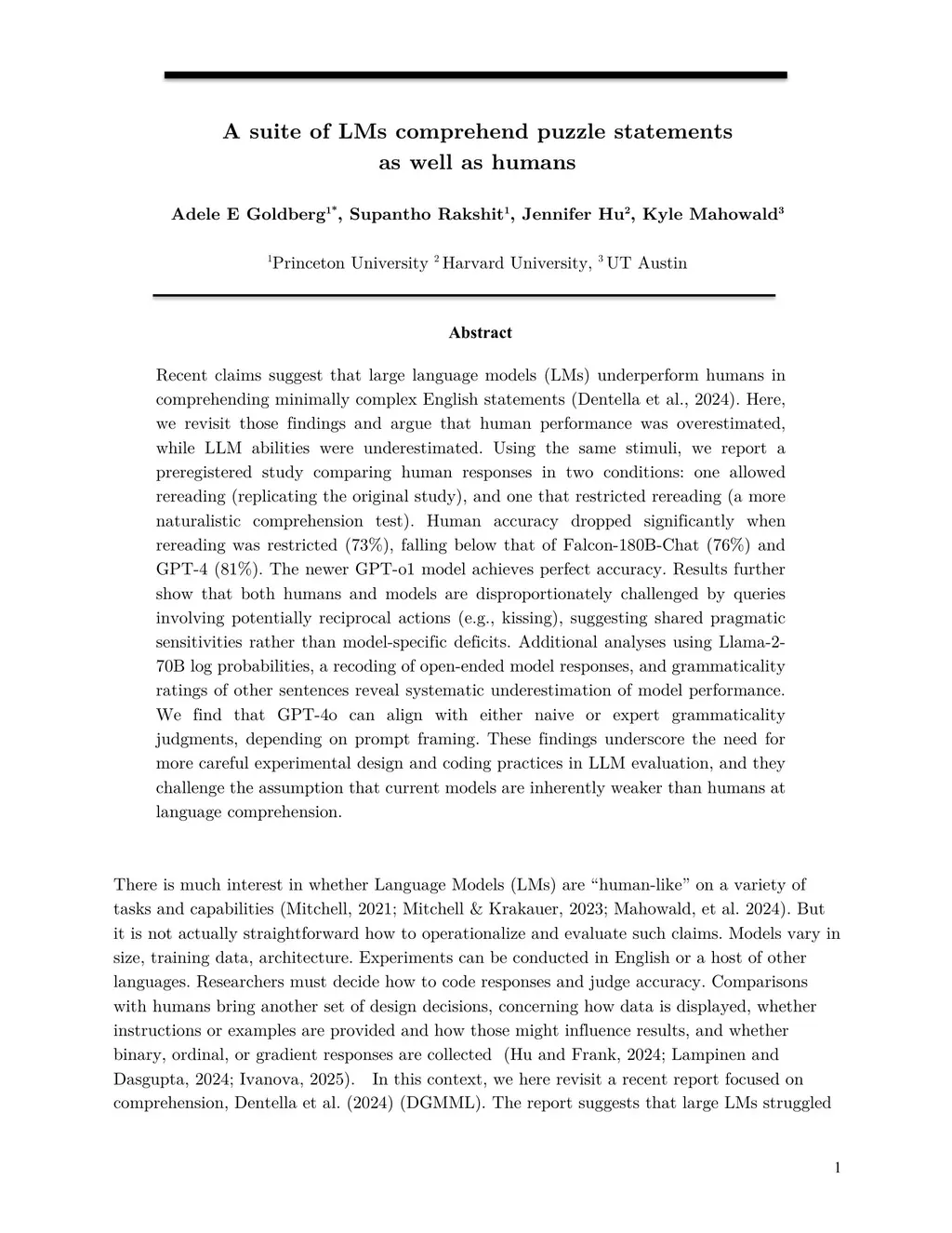 Recent claims suggest that large language models (LMs) underperform humans in comprehending minimally complex English statements (Dentella et al., 2024). Here, we revisit those findings and argue that human performance was overestimated, while LLM abilities were underestimated. Using the same stimuli, we report a preregistered study comparing human responses in two conditions: one allowed rereading (replicating the original study), and one that restricted rereading (a more naturalistic comprehension test). Human accuracy dropped significantly when rereading was restricted (73%), falling below that of Falcon-180B-Chat (76%) and GPT-4 (81%). The newer GPT-o1 model achieves perfect accuracy. Results further show that both humans and models are disproportionately challenged by queries involving potentially reciprocal actions (e.g., kissing), suggesting shared pragmatic sensitivities rather than model-specific deficits. Additional analyses using Llama-2-70B log probabilities, a recoding of open-ended model responses, and grammaticality ratings of other sentences reveal systematic underestimation of model performance. We find that GPT-4o can align with either naive or expert grammaticality judgments, depending on prompt framing. These findings underscore the need for more careful experimental design and coding practices in LLM evaluation, and they challenge the assumption that current models are inherently weaker than humans at language comprehension.