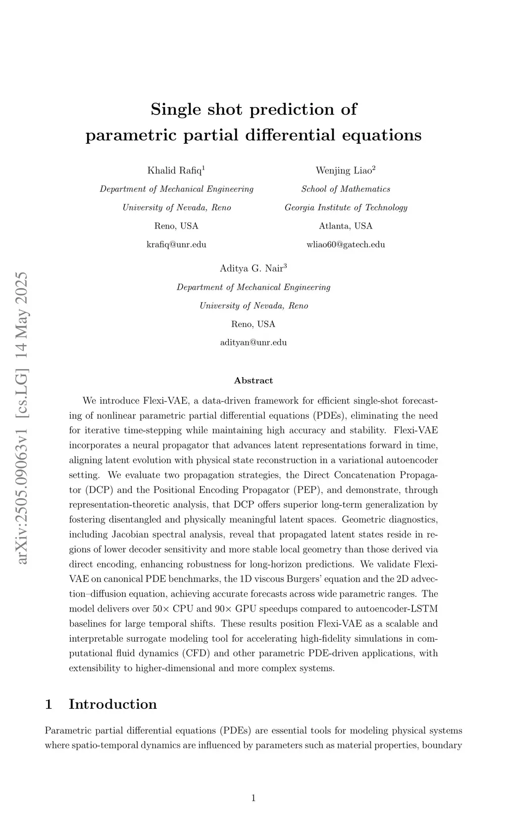 We introduce Flexi-VAE, a data-driven framework for efficient single-shot forecasting of nonlinear parametric partial differential equations (PDEs), eliminating the need for iterative time-stepping while maintaining high accuracy and stability. Flexi-VAE incorporates a neural propagator that advances latent representations forward in time, aligning latent evolution with physical state reconstruction in a variational autoencoder setting. We evaluate two propagation strategies, the Direct Concatenation Propagator (DCP) and the Positional Encoding Propagator (PEP), and demonstrate, through representation-theoretic analysis, that DCP offers superior long-term generalization by fostering disentangled and physically meaningful latent spaces. Geometric diagnostics, including Jacobian spectral analysis, reveal that propagated latent states reside in regions of lower decoder sensitivity and more stable local geometry than those derived via direct encoding, enhancing robustness for long-horizon predictions. We validate Flexi-VAE on canonical PDE benchmarks, the 1D viscous Burgers equation and the 2D advection-diffusion equation, achieving accurate forecasts across wide parametric ranges. The model delivers over 50x CPU and 90x GPU speedups compared to autoencoder-LSTM baselines for large temporal shifts. These results position Flexi-VAE as a scalable and interpretable surrogate modeling tool for accelerating high-fidelity simulations in computational fluid dynamics (CFD) and other parametric PDE-driven applications, with extensibility to higher-dimensional and more complex systems.