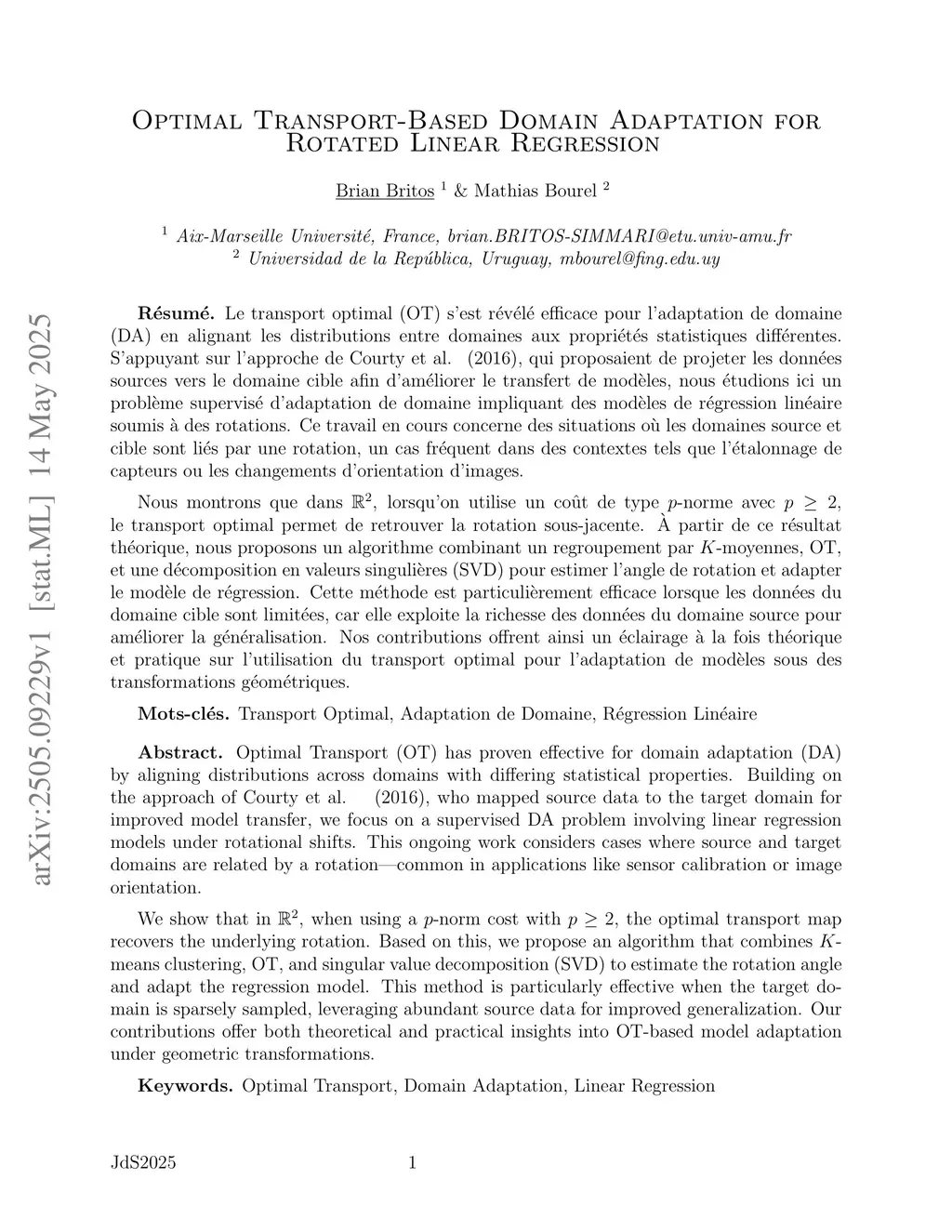 Optimal Transport (OT) has proven effective for domain adaptation (DA) by aligning distributions across domains with differing statistical properties. Building on the approach of Courty et al. (2016), who mapped source data to the target domain for improved model transfer, we focus on a supervised DA problem involving linear regression models under rotational shifts. This ongoing work considers cases where source and target domains are related by a rotation-common in applications like sensor calibration or image orientation. We show that in , when using a p-norm cost with $p 2$, the optimal transport map recovers the underlying rotation. Based on this, we propose an algorithm that combines K-means clustering, OT, and singular value decomposition (SVD) to estimate the rotation angle and adapt the regression model. This method is particularly effective when the target domain is sparsely sampled, leveraging abundant source data for improved generalization. Our contributions offer both theoretical and practical insights into OT-based model adaptation under geometric transformations.
