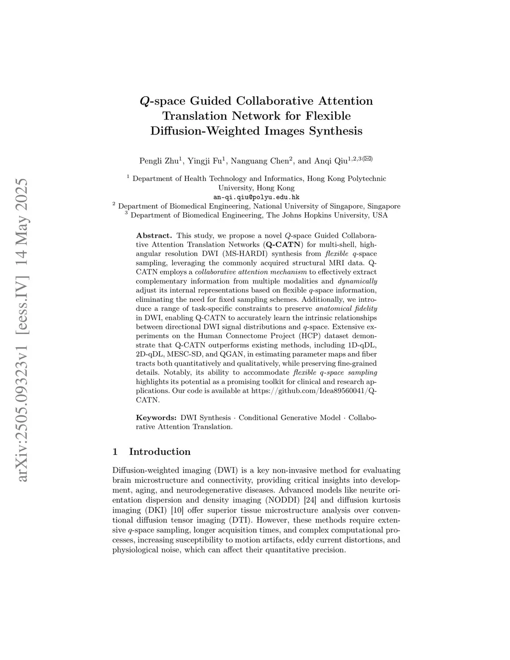 This study, we propose a novel Q-space Guided Collaborative Attention Translation Networks (Q-CATN) for multi-shell, high-angular resolution DWI (MS-HARDI) synthesis from flexible q-space sampling, leveraging the commonly acquired structural MRI data. Q-CATN employs a collaborative attention mechanism to effectively extract complementary information from multiple modalities and dynamically adjust its internal representations based on flexible q-space information, eliminating the need for fixed sampling schemes. Additionally, we introduce a range of task-specific constraints to preserve anatomical fidelity in DWI, enabling Q-CATN to accurately learn the intrinsic relationships between directional DWI signal distributions and q-space. Extensive experiments on the Human Connectome Project (HCP) dataset demonstrate that Q-CATN outperforms existing methods, including 1D-qDL, 2D-qDL, MESC-SD, and QGAN, in estimating parameter maps and fiber tracts both quantitatively and qualitatively, while preserving fine-grained details. Notably, its ability to accommodate flexible q-space sampling highlights its potential as a promising toolkit for clinical and research applications. Our code is available atthis https URL.