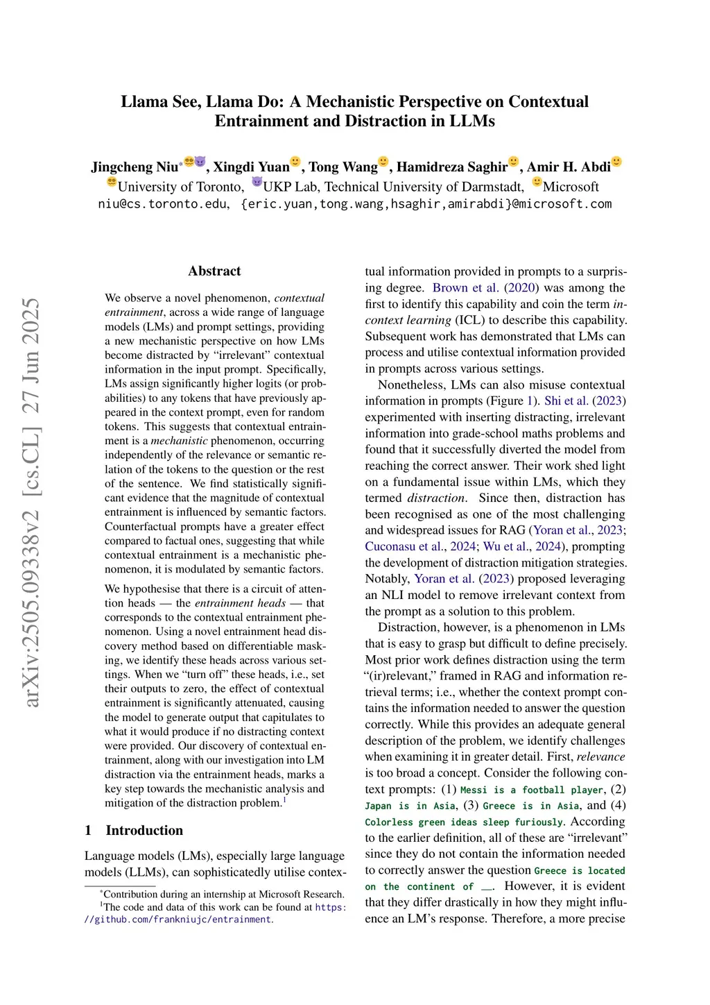 We observe a novel phenomenon, contextual entrainment, across a wide range of language models (LMs) and prompt settings, providing a new mechanistic perspective on how LMs become distracted by ``irrelevant'' contextual information in the input prompt. Specifically, LMs assign significantly higher logits (or probabilities) to any tokens that have previously appeared in the context prompt, even for random tokens. This suggests that contextual entrainment is a mechanistic phenomenon, occurring independently of the relevance or semantic relation of the tokens to the question or the rest of the sentence. We find statistically significant evidence that the magnitude of contextual entrainment is influenced by semantic factors. Counterfactual prompts have a greater effect compared to factual ones, suggesting that while contextual entrainment is a mechanistic phenomenon, it is modulated by semantic factors.We hypothesise that there is a circuit of attention heads -- the entrainment heads -- that corresponds to the contextual entrainment phenomenon. Using a novel entrainment head discovery method based on differentiable masking, we identify these heads across various settings. When we ``turn off'' these heads, i.e., set their outputs to zero, the effect of contextual entrainment is significantly attenuated, causing the model to generate output that capitulates to what it would produce if no distracting context were provided. Our discovery of contextual entrainment, along with our investigation into LM distraction via the entrainment heads, marks a key step towards the mechanistic analysis and mitigation of the distraction problem.