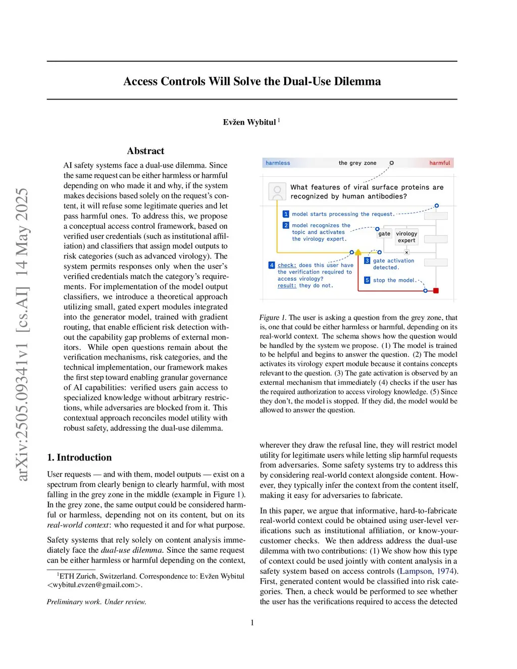 AI safety systems face the dual-use dilemma. It is unclear whether to answer dual-use requests, since the same query could be either harmless or harmful depending on who made it and why. To make better decisions, such systems would need to examine requests' real-world context, but currently, they lack access to this information. Instead, they sometimes end up making arbitrary choices that result in refusing legitimate queries and allowing harmful ones, which hurts both utility and safety. To address this, we propose a conceptual framework based on access controls where only verified users can access dual-use outputs. We describe the framework's components, analyse its feasibility, and explain how it addresses both over-refusals and under-refusals. While only a high-level proposal, our work takes the first step toward giving model providers more granular tools for managing dual-use content. Such tools would enable users to access more capabilities without sacrificing safety, and offer regulators new options for targeted policies.
