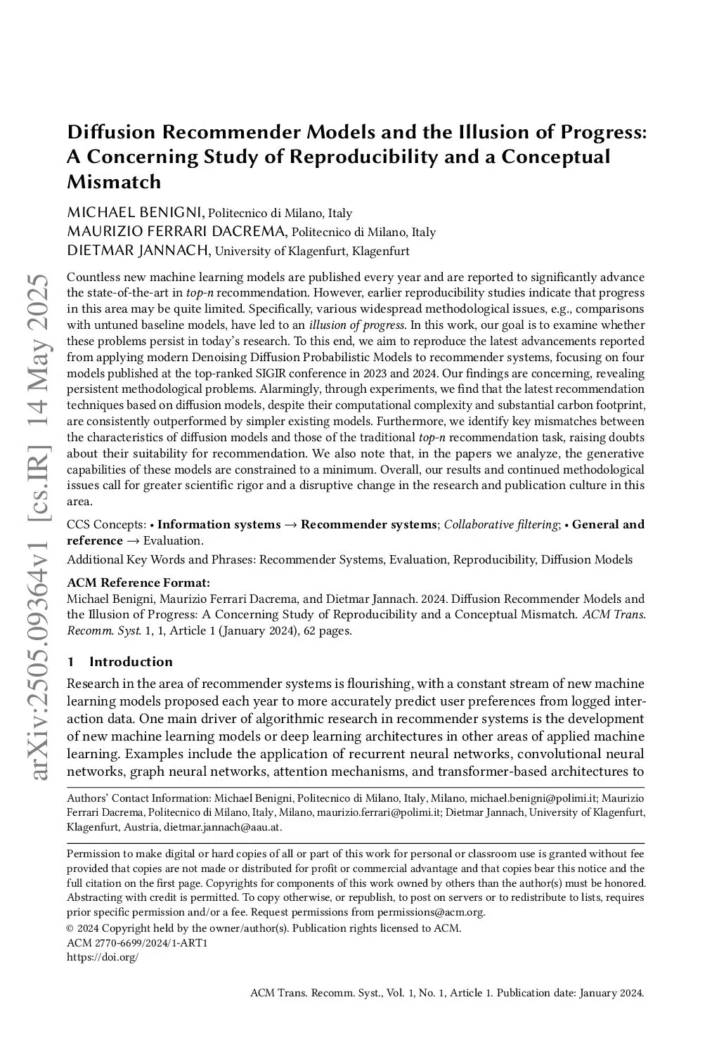 Countless new machine learning models are published every year and are reported to significantly advance the state-of-the-art in top-n recommendation. However, earlier reproducibility studies indicate that progress in this area may be quite limited, due to widespread methodological issues, e.g., comparisons with untuned baseline models, creating an illusion of progress. In this work, we examine whether these problems persist in today's research by attempting to reproduce nine SIGIR 2023 and 2024 recommendation algorithms based on Denoising Diffusion Probabilistic Models, a recent but rapidly expanding research area. Only 25% of reported results are fully reproducible and, since the original papers relied on weak baselines, they do not establish the superiority of diffusion models over state-of-the-art methods. In our controlled evaluations, well-tuned simpler baselines consistently exceed the diffusion-based models' effectiveness reported in the original papers. Furthermore, we identify key mismatches between the characteristics of diffusion models and those of the traditional top-n recommendation task, raising doubts about their suitability for recommendation. Moreover, in the analyzed papers, the generative capabilities of these models are constrained to a minimum. Overall, our results call for greater scientific rigor and a disruptive change in the research and publication culture in this area.