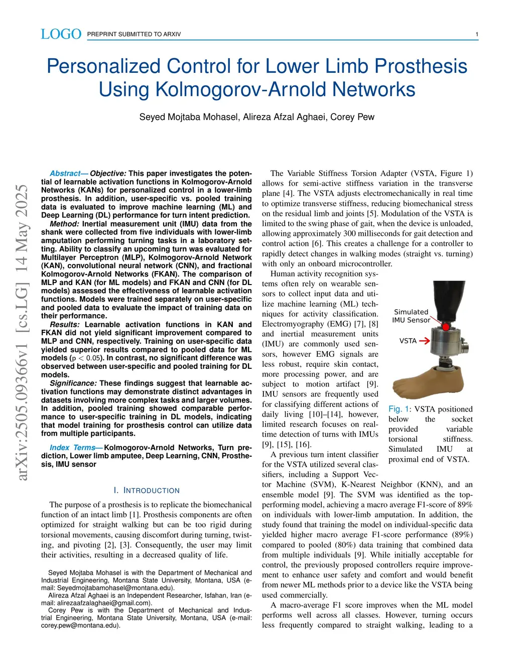 Objective: This paper investigates the potential of learnable activation functions in Kolmogorov-Arnold Networks (KANs) for personalized control in a lower-limb prosthesis. In addition, user-specific vs. pooled training data is evaluated to improve machine learning (ML) and Deep Learning (DL) performance for turn intent prediction.Method: Inertial measurement unit (IMU) data from the shank were collected from five individuals with lower-limb amputation performing turning tasks in a laboratory setting. Ability to classify an upcoming turn was evaluated for Multilayer Perceptron (MLP), Kolmogorov-Arnold Network (KAN), convolutional neural network (CNN), and fractional Kolmogorov-Arnold Networks (FKAN). The comparison of MLP and KAN (for ML models) and FKAN and CNN (for DL models) assessed the effectiveness of learnable activation functions. Models were trained separately on user-specific and pooled data to evaluate the impact of training data on their performance.Results: Learnable activation functions in KAN and FKAN did not yield significant improvement compared to MLP and CNN, respectively. Training on user-specific data yielded superior results compared to pooled data for ML models (). In contrast, no significant difference was observed between user-specific and pooled training for DL models.Significance: These findings suggest that learnable activation functions may demonstrate distinct advantages in datasets involving more complex tasks and larger volumes. In addition, pooled training showed comparable performance to user-specific training in DL models, indicating that model training for prosthesis control can utilize data from multiple participants.