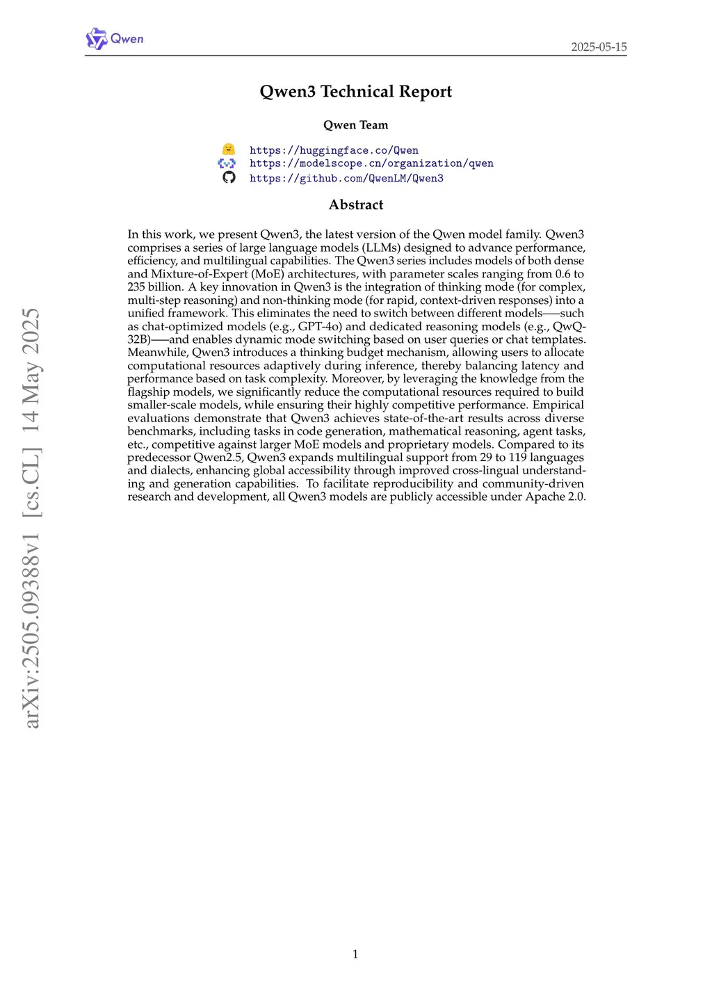 In this work, we present Qwen3, the latest version of the Qwen model family. Qwen3 comprises a series of large language models (LLMs) designed to advance performance, efficiency, and multilingual capabilities. The Qwen3 series includes models of both dense and Mixture-of-Expert (MoE) architectures, with parameter scales ranging from 0.6 to 235 billion. A key innovation in Qwen3 is the integration of thinking mode (for complex, multi-step reasoning) and non-thinking mode (for rapid, context-driven responses) into a unified framework. This eliminates the need to switch between different models--such as chat-optimized models (e.g., GPT-4o) and dedicated reasoning models (e.g., QwQ-32B)--and enables dynamic mode switching based on user queries or chat templates. Meanwhile, Qwen3 introduces a thinking budget mechanism, allowing users to allocate computational resources adaptively during inference, thereby balancing latency and performance based on task complexity. Moreover, by leveraging the knowledge from the flagship models, we significantly reduce the computational resources required to build smaller-scale models, while ensuring their highly competitive performance. Empirical evaluations demonstrate that Qwen3 achieves state-of-the-art results across diverse benchmarks, including tasks in code generation, mathematical reasoning, agent tasks, etc., competitive against larger MoE models and proprietary models. Compared to its predecessor Qwen2.5, Qwen3 expands multilingual support from 29 to 119 languages and dialects, enhancing global accessibility through improved cross-lingual understanding and generation capabilities. To facilitate reproducibility and community-driven research and development, all Qwen3 models are publicly accessible under Apache 2.0.