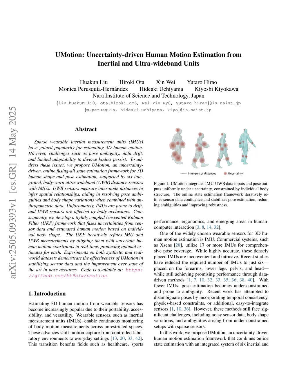 Sparse wearable inertial measurement units (IMUs) have gained popularity for estimating 3D human motion. However, challenges such as pose ambiguity, data drift, and limited adaptability to diverse bodies persist. To address these issues, we propose UMotion, an uncertainty-driven, online fusing-all state estimation framework for 3D human shape and pose estimation, supported by six integrated, body-worn ultra-wideband (UWB) distance sensors with IMUs. UWB sensors measure inter-node distances to infer spatial relationships, aiding in resolving pose ambiguities and body shape variations when combined with anthropometric data. Unfortunately, IMUs are prone to drift, and UWB sensors are affected by body occlusions. Consequently, we develop a tightly coupled Unscented Kalman Filter (UKF) framework that fuses uncertainties from sensor data and estimated human motion based on individual body shape. The UKF iteratively refines IMU and UWB measurements by aligning them with uncertain human motion constraints in real-time, producing optimal estimates for each. Experiments on both synthetic and real-world datasets demonstrate the effectiveness of UMotion in stabilizing sensor data and the improvement over state of the art in pose accuracy.