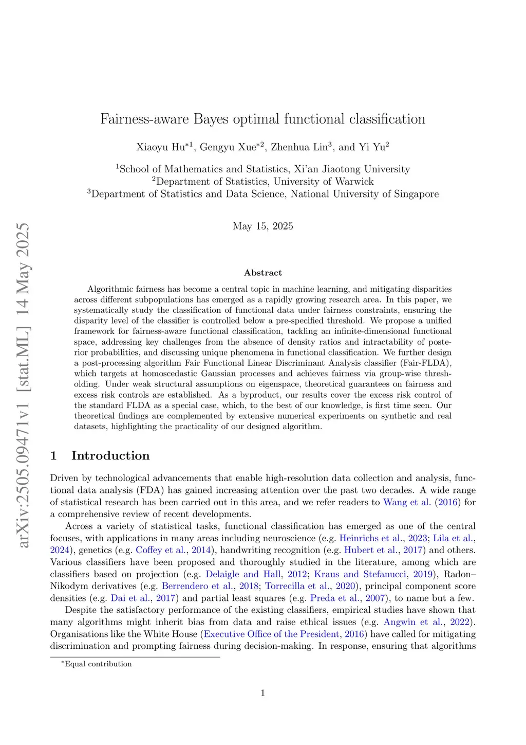 Algorithmic fairness has become a central topic in machine learning, and mitigating disparities across different subpopulations has emerged as a rapidly growing research area. In this paper, we systematically study the classification of functional data under fairness constraints, ensuring the disparity level of the classifier is controlled below a pre-specified threshold. We propose a unified framework for fairness-aware functional classification, tackling an infinite-dimensional functional space, addressing key challenges from the absence of density ratios and intractability of posterior probabilities, and discussing unique phenomena in functional classification. We further design a post-processing algorithm, Fair Functional Linear Discriminant Analysis classifier (Fair-FLDA), which targets at homoscedastic Gaussian processes and achieves fairness via group-wise thresholding. Under weak structural assumptions on eigenspace, theoretical guarantees on fairness and excess risk controls are established. As a byproduct, our results cover the excess risk control of the standard FLDA as a special case, which, to the best of our knowledge, is first time seen. Our theoretical findings are complemented by extensive numerical experiments on synthetic and real datasets, highlighting the practicality of our designed algorithm.