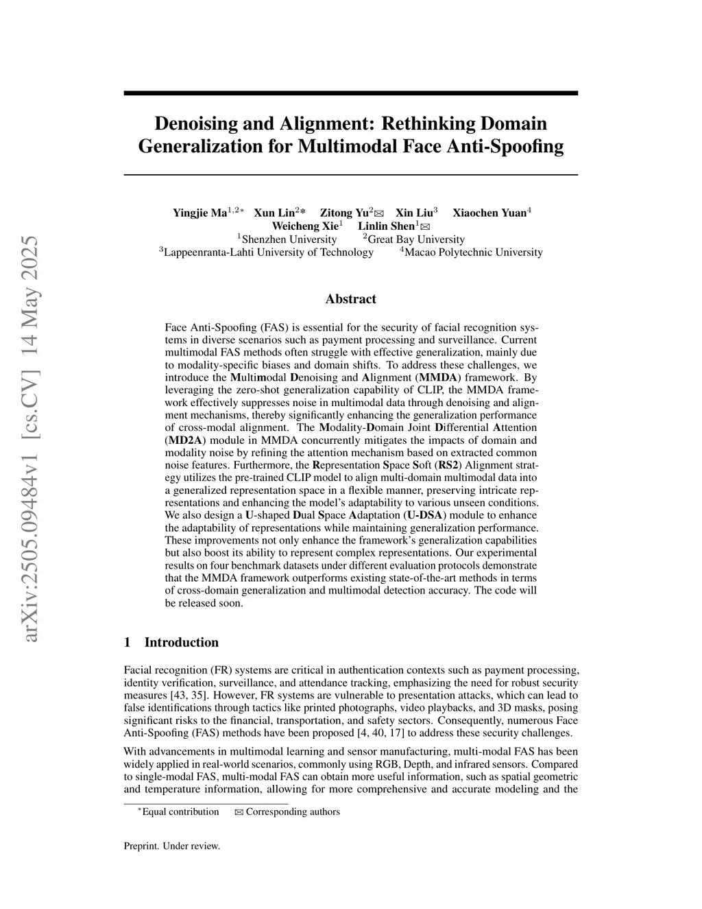 Face Anti-Spoofing (FAS) is essential for the security of facial recognition systems in diverse scenarios such as payment processing and surveillance. Current multimodal FAS methods often struggle with effective generalization, mainly due to modality-specific biases and domain shifts. To address these challenges, we introduce the \textbf{M}ulti\textbf{m}odal \textbf{D}enoising and \textbf{A}lignment (\textbf{MMDA}) framework. By leveraging the zero-shot generalization capability of CLIP, the MMDA framework effectively suppresses noise in multimodal data through denoising and alignment mechanisms, thereby significantly enhancing the generalization performance of cross-modal alignment. The \textbf{M}odality-\textbf{D}omain Joint \textbf{D}ifferential \textbf{A}ttention (\textbf{MD2A}) module in MMDA concurrently mitigates the impacts of domain and modality noise by refining the attention mechanism based on extracted common noise features. Furthermore, the \textbf{R}epresentation \textbf{S}pace \textbf{S}oft (\textbf{RS2}) Alignment strategy utilizes the pre-trained CLIP model to align multi-domain multimodal data into a generalized representation space in a flexible manner, preserving intricate representations and enhancing the model's adaptability to various unseen conditions. We also design a \textbf{U}-shaped \textbf{D}ual \textbf{S}pace \textbf{A}daptation (\textbf{U-DSA}) module to enhance the adaptability of representations while maintaining generalization performance. These improvements not only enhance the framework's generalization capabilities but also boost its ability to represent complex representations. Our experimental results on four benchmark datasets under different evaluation protocols demonstrate that the MMDA framework outperforms existing state-of-the-art methods in terms of cross-domain generalization and multimodal detection accuracy. The code will be released soon.