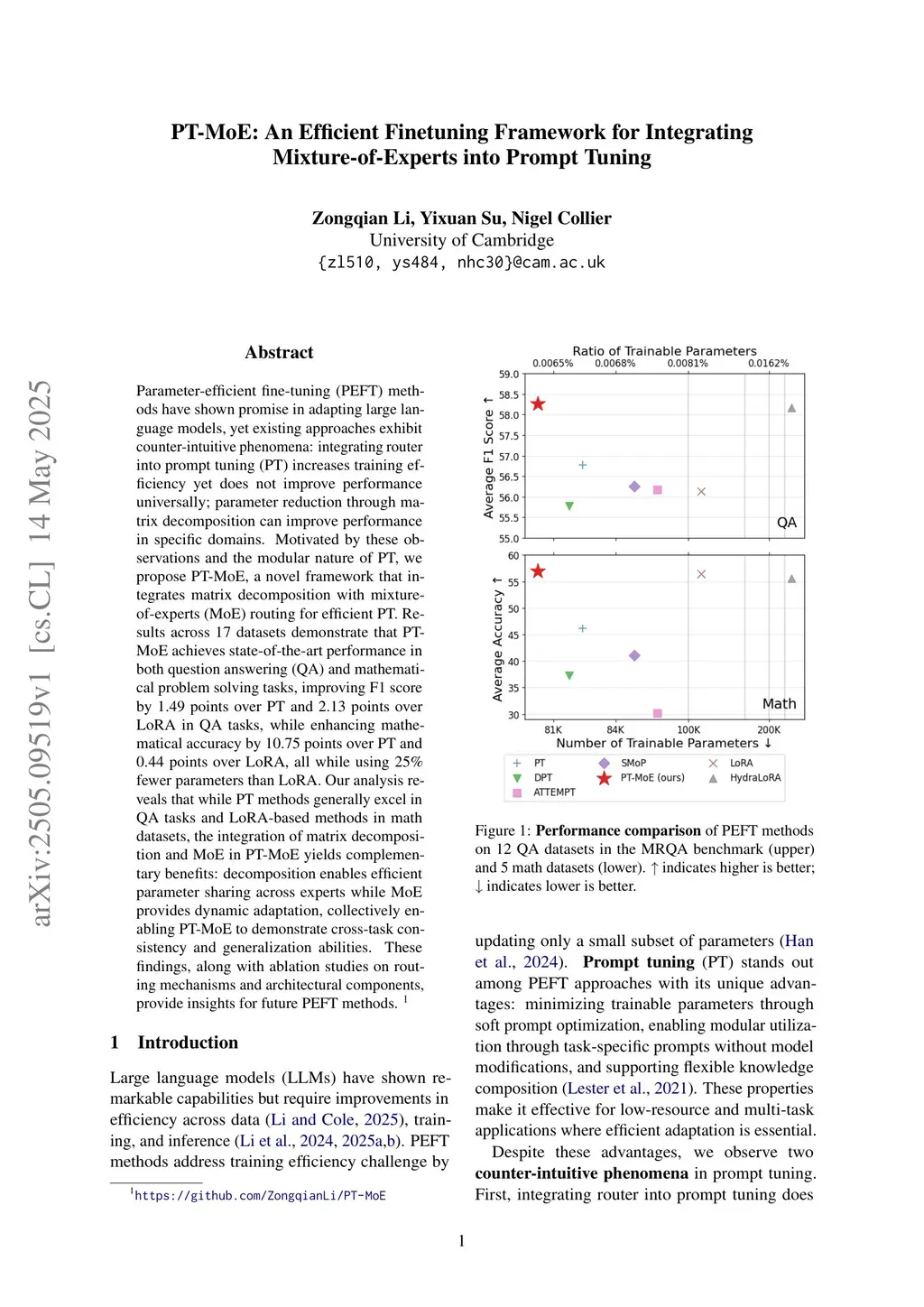 Parameter-efficient fine-tuning (PEFT) methods have shown promise in adapting large language models, yet existing approaches exhibit counter-intuitive phenomena: integrating router into prompt tuning (PT) increases training efficiency yet does not improve performance universally; parameter reduction through matrix decomposition can improve performance in specific domains. Motivated by these observations and the modular nature of PT, we propose PT-MoE, a novel framework that integrates matrix decomposition with mixture-of-experts (MoE) routing for efficient PT. Results across 17 datasets demonstrate that PT-MoE achieves state-of-the-art performance in both question answering (QA) and mathematical problem solving tasks, improving F1 score by 1.49 points over PT and 2.13 points over LoRA in QA tasks, while enhancing mathematical accuracy by 10.75 points over PT and 0.44 points over LoRA, all while using 25% fewer parameters than LoRA. Our analysis reveals that while PT methods generally excel in QA tasks and LoRA-based methods in math datasets, the integration of matrix decomposition and MoE in PT-MoE yields complementary benefits: decomposition enables efficient parameter sharing across experts while MoE provides dynamic adaptation, collectively enabling PT-MoE to demonstrate cross-task consistency and generalization abilities. These findings, along with ablation studies on routing mechanisms and architectural components, provide insights for future PEFT methods.