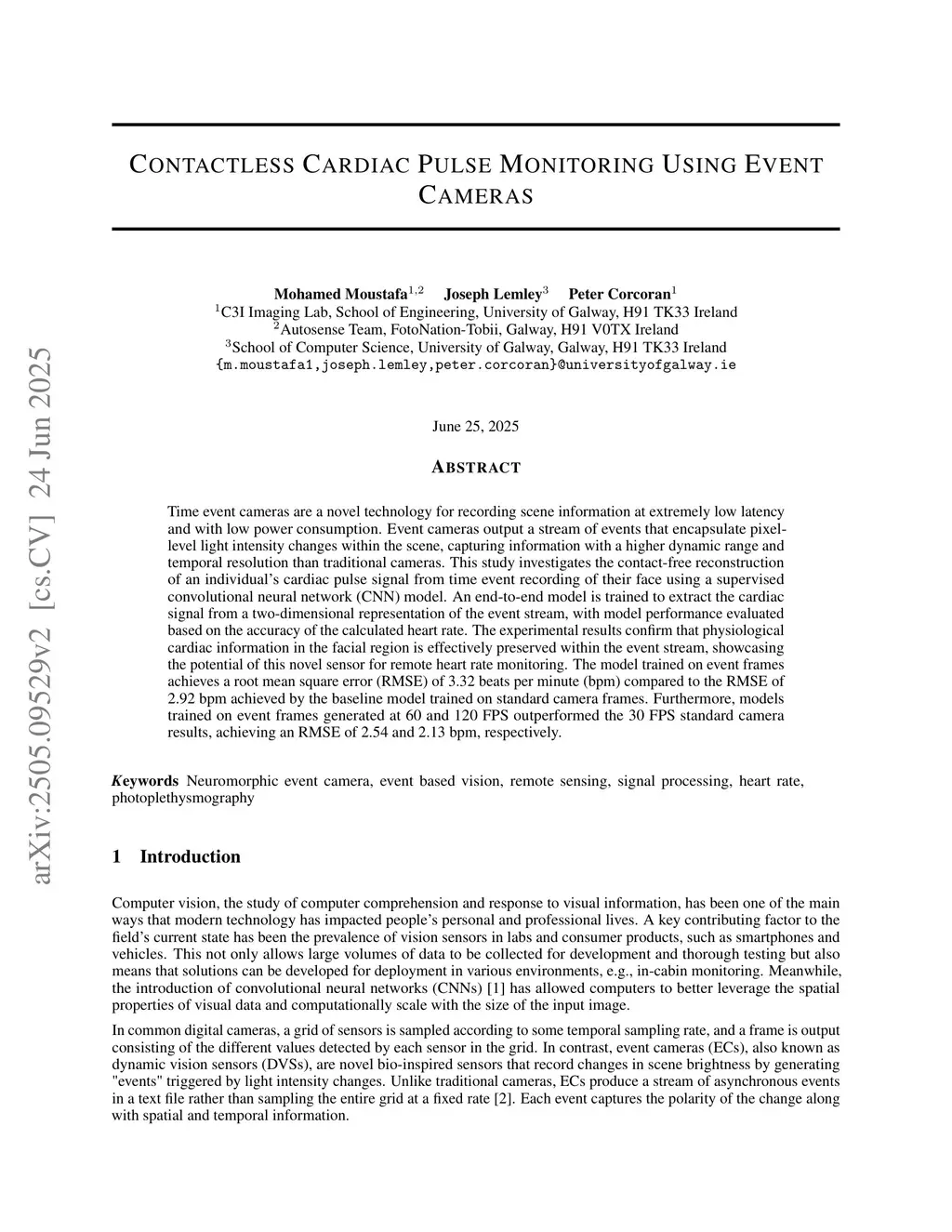 Time event cameras are a novel technology for recording scene information at extremely low latency and with low power consumption. Event cameras output a stream of events that encapsulate pixel-level light intensity changes within the scene, capturing information with a higher dynamic range and temporal resolution than traditional cameras. This study investigates the contact-free reconstruction of an individual's cardiac pulse signal from time event recording of their face using a supervised convolutional neural network (CNN) model. An end-to-end model is trained to extract the cardiac signal from a two-dimensional representation of the event stream, with model performance evaluated based on the accuracy of the calculated heart rate. The experimental results confirm that physiological cardiac information in the facial region is effectively preserved within the event stream, showcasing the potential of this novel sensor for remote heart rate monitoring. The model trained on event frames achieves a root mean square error (RMSE) of 3.32 beats per minute (bpm) compared to the RMSE of 2.92 bpm achieved by the baseline model trained on standard camera frames. Furthermore, models trained on event frames generated at 60 and 120 FPS outperformed the 30 FPS standard camera results, achieving an RMSE of 2.54 and 2.13 bpm, respectively.