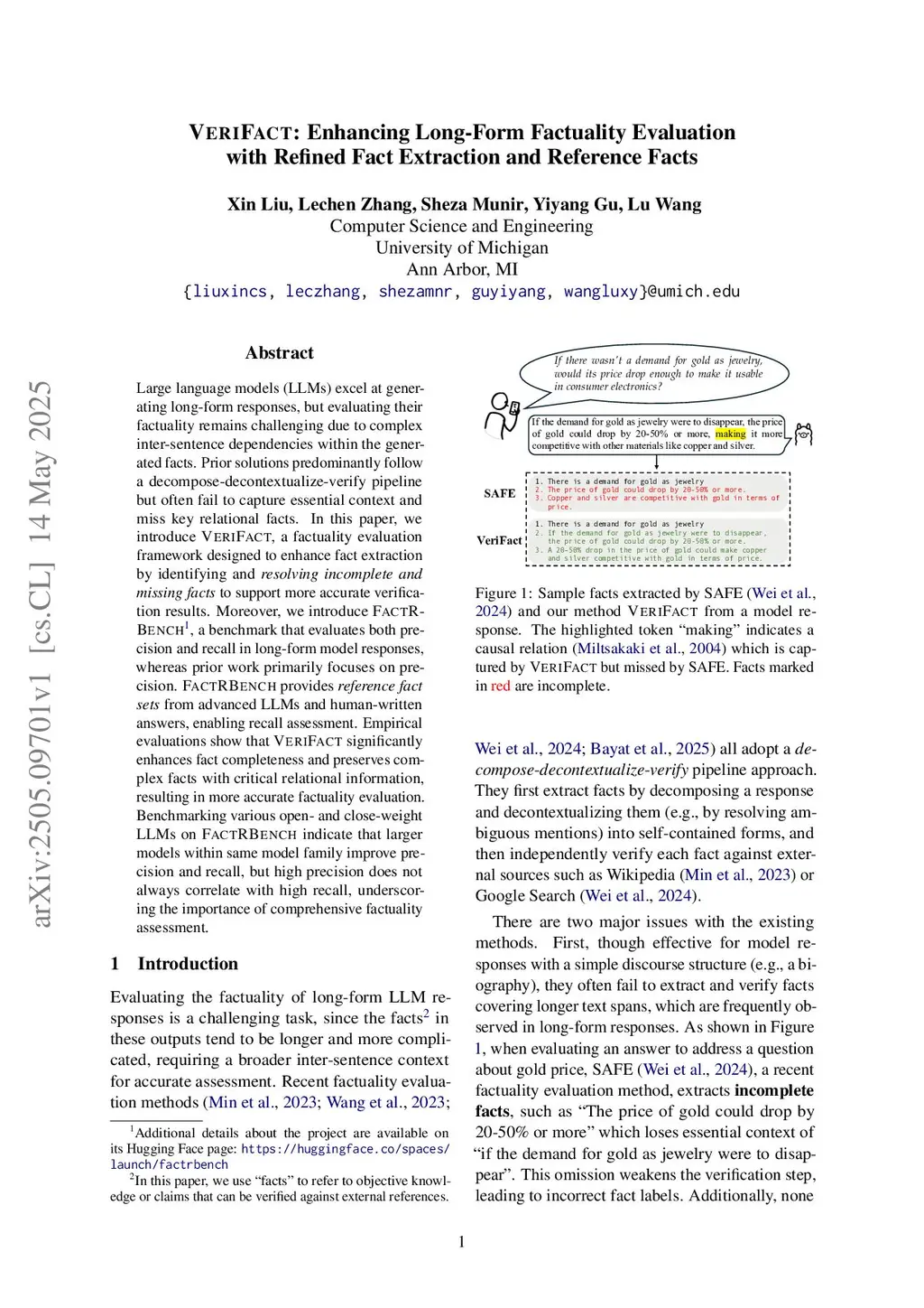 Large language models (LLMs) excel at generating long-form responses, but evaluating their factuality remains challenging due to complex inter-sentence dependencies within the generated facts. Prior solutions predominantly follow a decompose-decontextualize-verify pipeline but often fail to capture essential context and miss key relational facts. In this paper, we introduce VeriFact, a factuality evaluation framework designed to enhance fact extraction by identifying and resolving incomplete and missing facts to support more accurate verification results. Moreover, we introduce FactRBench , a benchmark that evaluates both precision and recall in long-form model responses, whereas prior work primarily focuses on precision. FactRBench provides reference fact sets from advanced LLMs and human-written answers, enabling recall assessment. Empirical evaluations show that VeriFact significantly enhances fact completeness and preserves complex facts with critical relational information, resulting in more accurate factuality evaluation. Benchmarking various open- and close-weight LLMs on FactRBench indicate that larger models within same model family improve precision and recall, but high precision does not always correlate with high recall, underscoring the importance of comprehensive factuality assessment.