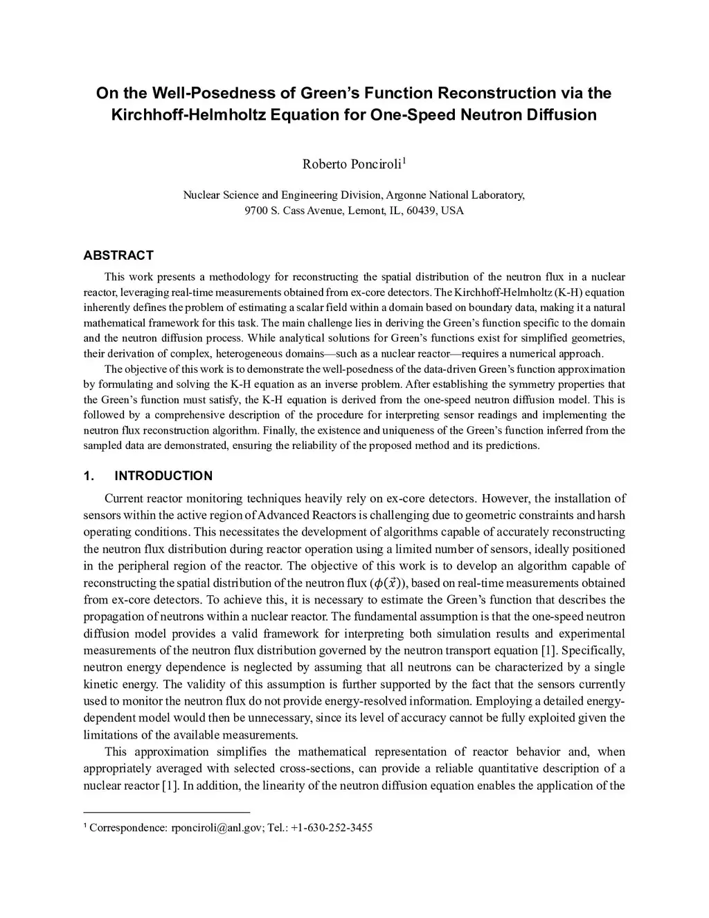 This work presents a methodology for reconstructing the spatial distribution of the neutron flux in a nuclear reactor, leveraging real-time measurements obtained from ex-core detectors. The Kirchhoff-Helmholtz (K-H) equation inherently defines the problem of estimating a scalar field within a domain based on boundary data, making it a natural mathematical framework for this task. The main challenge lies in deriving the Green's function specific to the domain and the neutron diffusion process. While analytical solutions for Green's functions exist for simplified geometries, their derivation of complex, heterogeneous domains-such as a nuclear reactor-requires a numerical approach. The objective of this work is to demonstrate the well-posedness of the data-driven Green's function approximation by formulating and solving the K-H equation as an inverse problem. After establishing the symmetry properties that the Green's function must satisfy, the K-H equation is derived from the one-speed neutron diffusion model. This is followed by a comprehensive description of the procedure for interpreting sensor readings and implementing the neutron flux reconstruction algorithm. Finally, the existence and uniqueness of the Green's function inferred from the sampled data are demonstrated, ensuring the reliability of the proposed method and its predictions.
