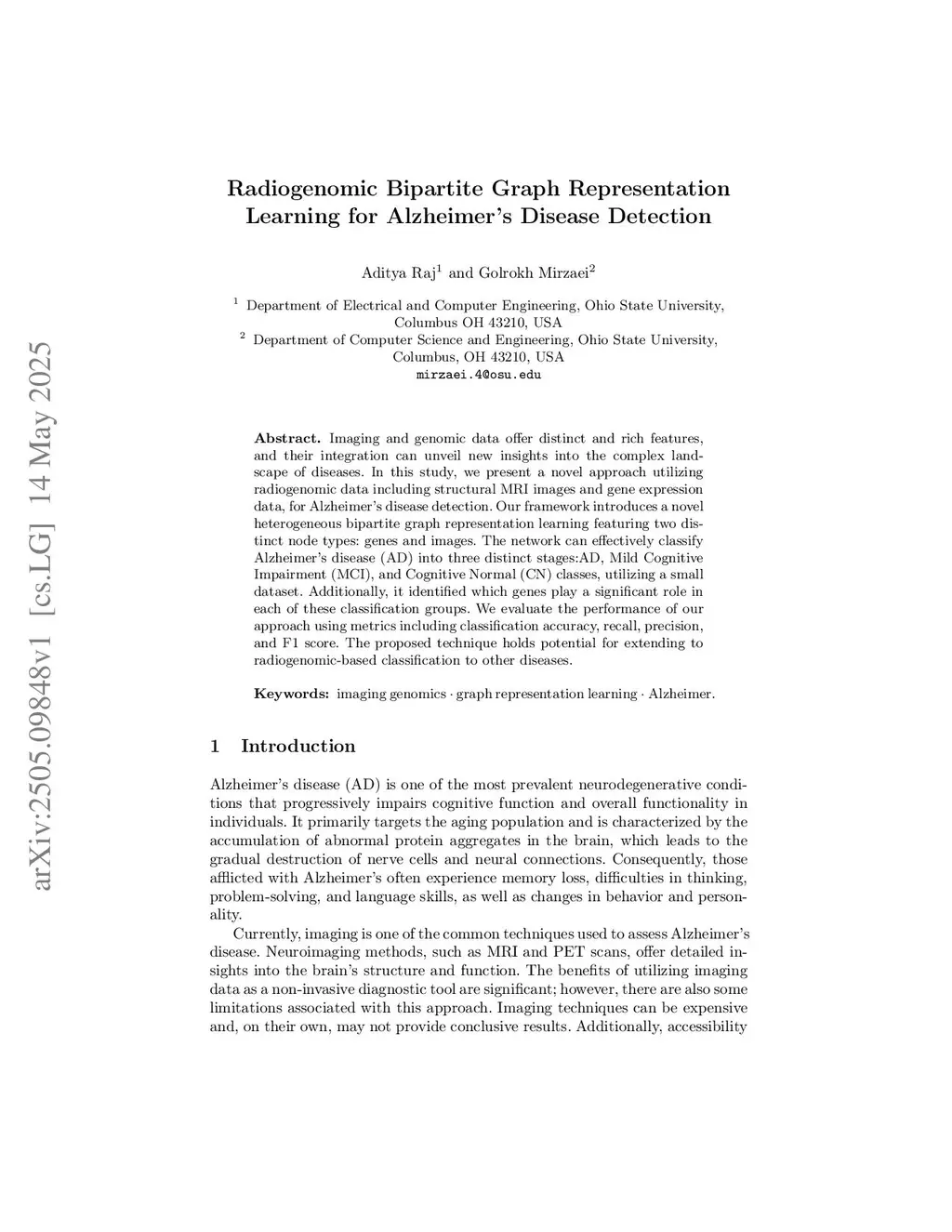Imaging and genomic data offer distinct and rich features, and their integration can unveil new insights into the complex landscape of diseases. In this study, we present a novel approach utilizing radiogenomic data including structural MRI images and gene expression data, for Alzheimer's disease detection. Our framework introduces a novel heterogeneous bipartite graph representation learning featuring two distinct node types: genes and images. The network can effectively classify Alzheimer's disease (AD) into three distinct stages:AD, Mild Cognitive Impairment (MCI), and Cognitive Normal (CN) classes, utilizing a small dataset. Additionally, it identified which genes play a significant role in each of these classification groups. We evaluate the performance of our approach using metrics including classification accuracy, recall, precision, and F1 score. The proposed technique holds potential for extending to radiogenomic-based classification to other diseases.