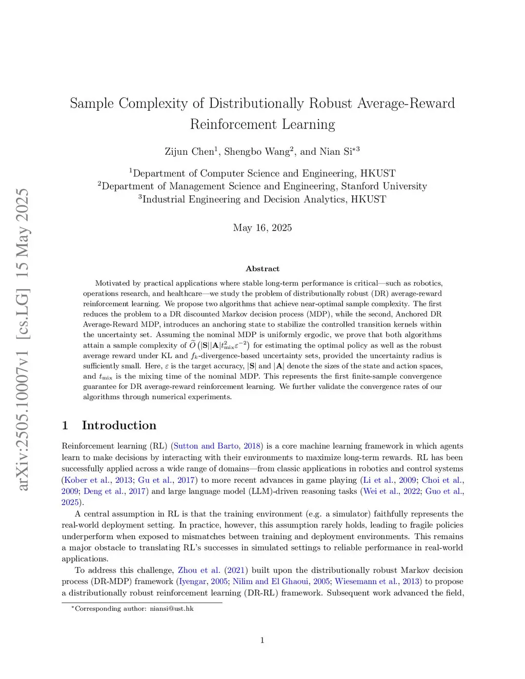Motivated by practical applications where stable long-term performance is critical-such as robotics, operations research, and healthcare-we study the problem of distributionally robust (DR) average-reward reinforcement learning. We propose two algorithms that achieve near-optimal sample complexity. The first reduces the problem to a DR discounted Markov decision process (MDP), while the second, Anchored DR Average-Reward MDP, introduces an anchoring state to stabilize the controlled transition kernels within the uncertainty set. Assuming the nominal MDP is uniformly ergodic, we prove that both algorithms attain a sample complexity of for estimating the optimal policy as well as the robust average reward under KL and -divergence-based uncertainty sets, provided the uncertainty radius is sufficiently small. Here, is the target accuracy, and denote the sizes of the state and action spaces, and is the mixing time of the nominal MDP. This represents the first finite-sample convergence guarantee for DR average-reward reinforcement learning. We further validate the convergence rates of our algorithms through numerical experiments.