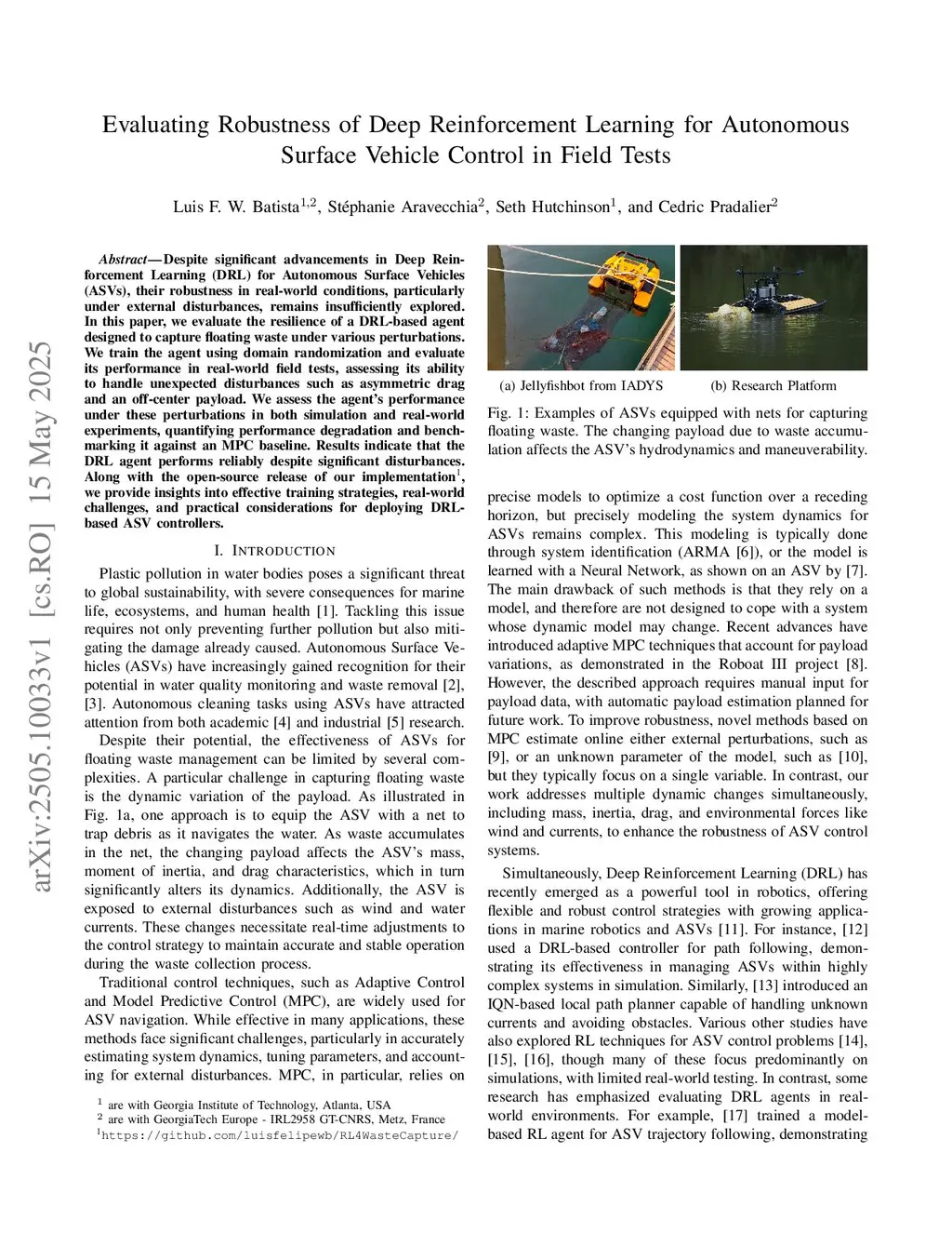 Despite significant advancements in Deep Reinforcement Learning (DRL) for Autonomous Surface Vehicles (ASVs), their robustness in real-world conditions, particularly under external disturbances, remains insufficiently explored. In this paper, we evaluate the resilience of a DRL-based agent designed to capture floating waste under various perturbations. We train the agent using domain randomization and evaluate its performance in real-world field tests, assessing its ability to handle unexpected disturbances such as asymmetric drag and an off-center payload. We assess the agent's performance under these perturbations in both simulation and real-world experiments, quantifying performance degradation and benchmarking it against an MPC baseline. Results indicate that the DRL agent performs reliably despite significant disturbances. Along with the open-source release of our implementation, we provide insights into effective training strategies, real-world challenges, and practical considerations for deploying DRLbased ASV controllers.