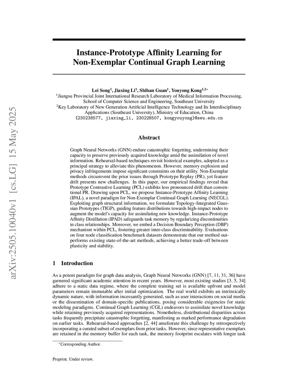Graph Neural Networks (GNN) endure catastrophic forgetting, undermining their capacity to preserve previously acquired knowledge amid the assimilation of novel information. Rehearsal-based techniques revisit historical examples, adopted as a principal strategy to alleviate this phenomenon. However, memory explosion and privacy infringements impose significant constraints on their utility. Non-Exemplar methods circumvent the prior issues through Prototype Replay (PR), yet feature drift presents new challenges. In this paper, our empirical findings reveal that Prototype Contrastive Learning (PCL) exhibits less pronounced drift than conventional PR. Drawing upon PCL, we propose Instance-Prototype Affinity Learning (IPAL), a novel paradigm for Non-Exemplar Continual Graph Learning (NECGL). Exploiting graph structural information, we formulate Topology-Integrated Gaussian Prototypes (TIGP), guiding feature distributions towards high-impact nodes to augment the model's capacity for assimilating new knowledge. Instance-Prototype Affinity Distillation (IPAD) safeguards task memory by regularizing discontinuities in class relationships. Moreover, we embed a Decision Boundary Perception (DBP) mechanism within PCL, fostering greater inter-class discriminability. Evaluations on four node classification benchmark datasets demonstrate that our method outperforms existing state-of-the-art methods, achieving a better trade-off between plasticity and stability.