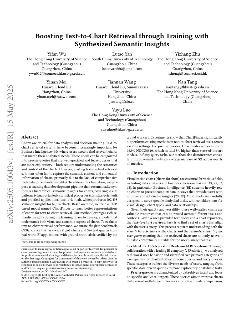 Charts are crucial for data analysis andthis http URL-to-chart retrieval systems have become increasingly important for Business Intelligence (BI), where users need to find relevant charts that match their analytical needs. These needs can be categorized into precise queries that are well-specified and fuzzy queries that are more exploratory -- both require understanding the semantics and context of the charts. However, existing text-to-chart retrieval solutions often fail to capture the semantic content and contextual information of charts, primarily due to the lack of comprehensive metadata (or semantic insights). To address this limitation, we propose a training data development pipeline that automatically synthesizes hierarchical semantic insights for charts, covering visual patterns (visual-oriented), statistical properties (statistics-oriented), and practical applications (task-oriented), which produces 207,498 semantic insights for 69,166 charts. Based on these, we train a CLIP-based model named ChartFinder to learn better representations of charts for text-to-chart retrieval. Our method leverages rich semantic insights during the training phase to develop a model that understands both visual and semantic aspects ofthis http URLevaluate text-to-chart retrieval performance, we curate the first benchmark, CRBench, for this task with 21,862 charts and 326 text queries from real-world BI applications, with ground-truth labels verified by the crowdthis http URLshow that ChartFinder significantly outperforms existing methods in text-to-chart retrieval tasks across various settings. For precise queries, ChartFinder achieves up to 66.9% NDCG@10, which is 11.58% higher than state-of-the-art models. In fuzzy query tasks, our method also demonstrates consistent improvements, with an average increase of 5% across nearly all metrics.