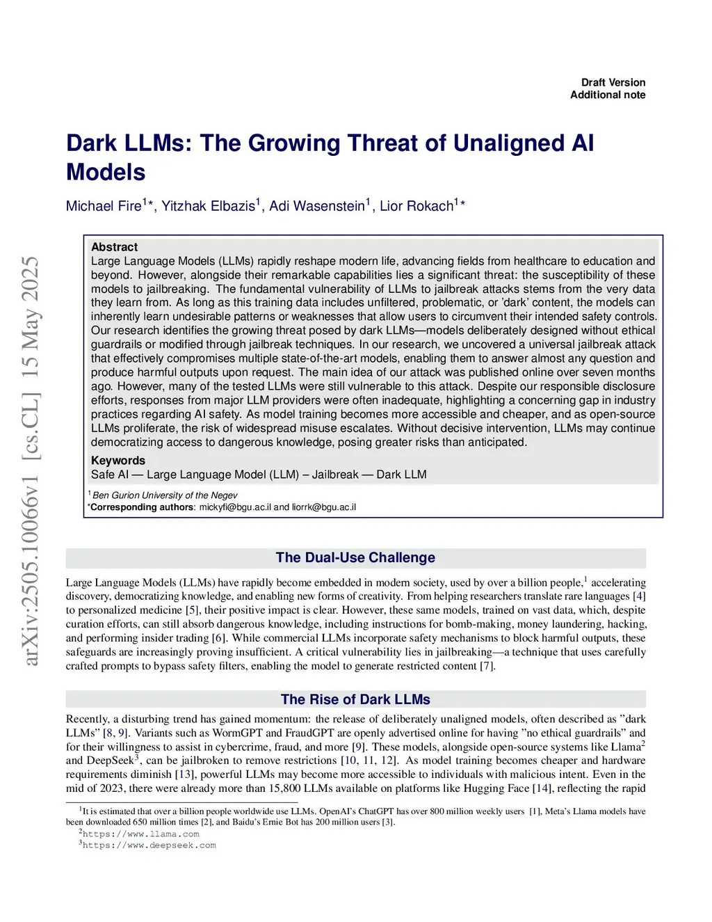 Large Language Models (LLMs) rapidly reshape modern life, advancing fields from healthcare to education and beyond. However, alongside their remarkable capabilities lies a significant threat: the susceptibility of these models to jailbreaking. The fundamental vulnerability of LLMs to jailbreak attacks stems from the very data they learn from. As long as this training data includes unfiltered, problematic, or 'dark' content, the models can inherently learn undesirable patterns or weaknesses that allow users to circumvent their intended safety controls. Our research identifies the growing threat posed by dark LLMs models deliberately designed without ethical guardrails or modified through jailbreak techniques. In our research, we uncovered a universal jailbreak attack that effectively compromises multiple state-of-the-art models, enabling them to answer almost any question and produce harmful outputs upon request. The main idea of our attack was published online over seven months ago. However, many of the tested LLMs were still vulnerable to this attack. Despite our responsible disclosure efforts, responses from major LLM providers were often inadequate, highlighting a concerning gap in industry practices regarding AI safety. As model training becomes more accessible and cheaper, and as open-source LLMs proliferate, the risk of widespread misuse escalates. Without decisive intervention, LLMs may continue democratizing access to dangerous knowledge, posing greater risks than anticipated.