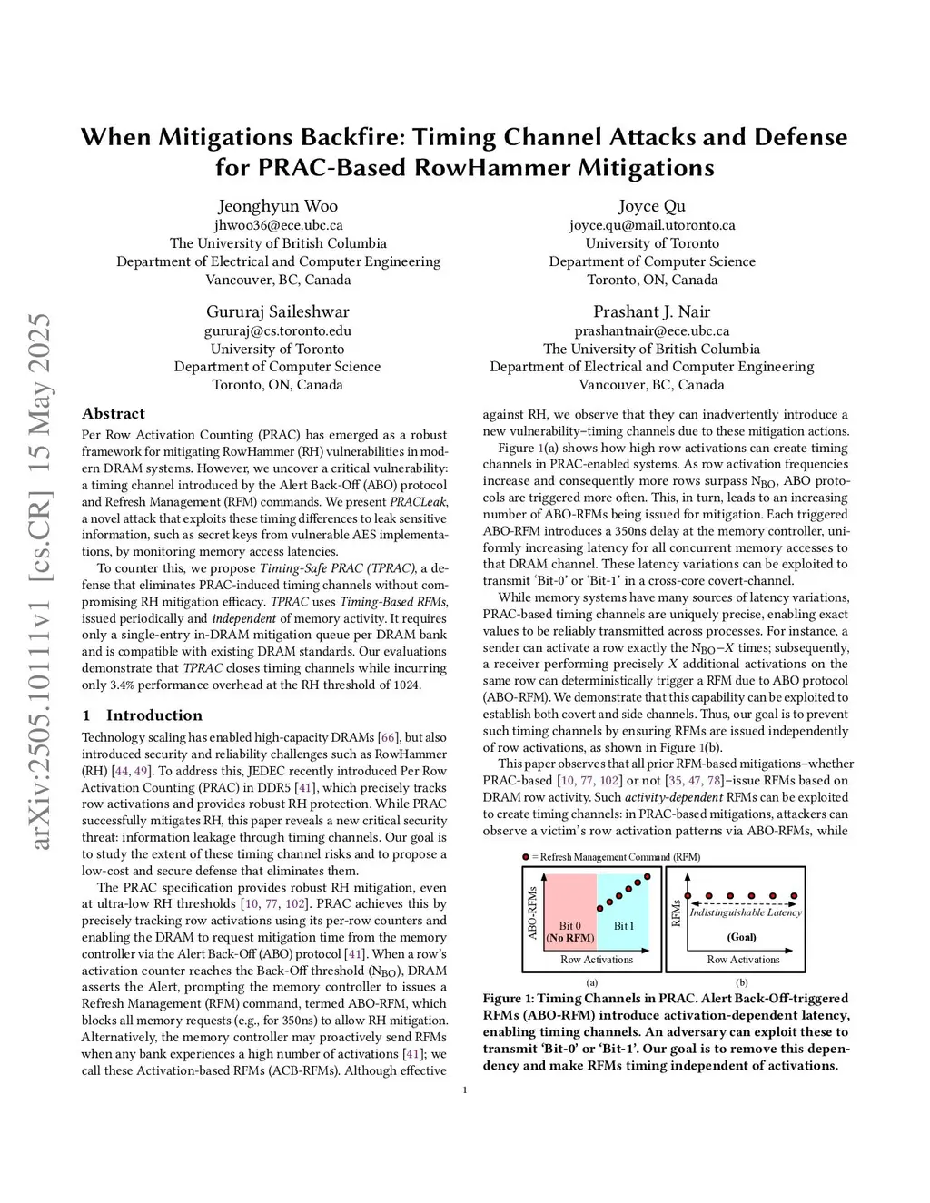 Per Row Activation Counting (PRAC) has emerged as a robust framework for mitigating RowHammer (RH) vulnerabilities in modern DRAM systems. However, we uncover a critical vulnerability: a timing channel introduced by the Alert Back-Off (ABO) protocol and Refresh Management (RFM) commands. We present PRACLeak, a novel attack that exploits these timing differences to leak sensitive information, such as secret keys from vulnerable AES implementations, by monitoring memory access latencies.To counter this, we propose Timing-Safe PRAC (TPRAC), a defense that eliminates PRAC-induced timing channels without compromising RH mitigation efficacy. TPRAC uses Timing-Based RFMs, issued periodically and independent of memory activity. It requires only a single-entry in-DRAM mitigation queue per DRAM bank and is compatible with existing DRAM standards. Our evaluations demonstrate that TPRAC closes timing channels while incurring only 3.4% performance overhead at the RH threshold of 1024.