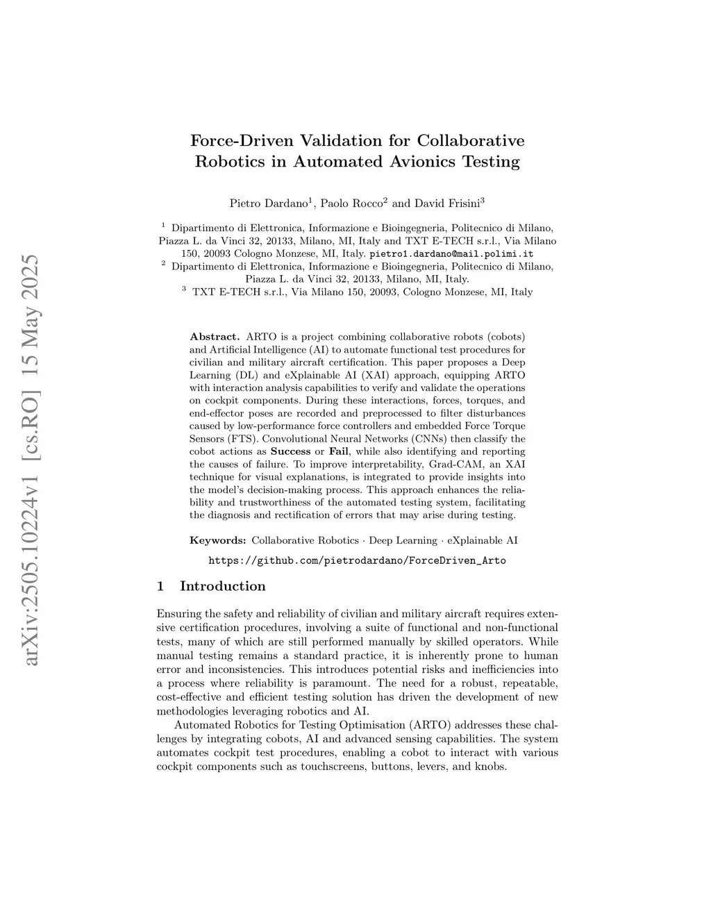 ARTO is a project combining collaborative robots (cobots) and Artificial Intelligence (AI) to automate functional test procedures for civilian and military aircraft certification. This paper proposes a Deep Learning (DL) and eXplainable AI (XAI) approach, equipping ARTO with interaction analysis capabilities to verify and validate the operations on cockpit components. During these interactions, forces, torques, and end effector poses are recorded and preprocessed to filter disturbances caused by low performance force controllers and embedded Force Torque Sensors (FTS). Convolutional Neural Networks (CNNs) then classify the cobot actions as Success or Fail, while also identifying and reporting the causes of failure. To improve interpretability, Grad CAM, an XAI technique for visual explanations, is integrated to provide insights into the models decision making process. This approach enhances the reliability and trustworthiness of the automated testing system, facilitating the diagnosis and rectification of errors that may arise during testing.