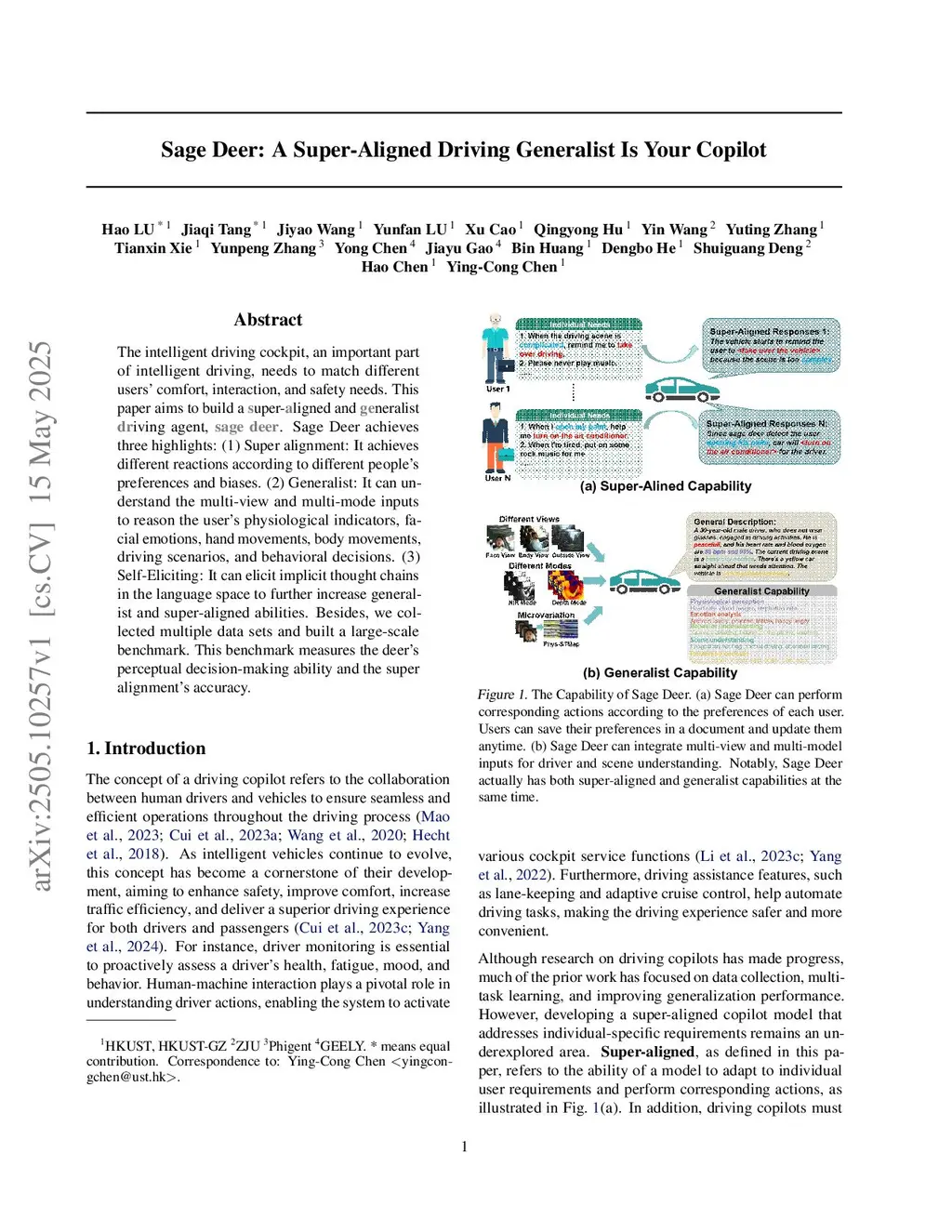 The intelligent driving cockpit, an important part of intelligent driving, needs to match different users' comfort, interaction, and safety needs. This paper aims to build a Super-Aligned and GEneralist DRiving agent, SAGE DeeR. Sage Deer achieves three highlights: (1) Super alignment: It achieves different reactions according to different people's preferences and biases. (2) Generalist: It can understand the multi-view and multi-mode inputs to reason the user's physiological indicators, facial emotions, hand movements, body movements, driving scenarios, and behavioral decisions. (3) Self-Eliciting: It can elicit implicit thought chains in the language space to further increase generalist and super-aligned abilities. Besides, we collected multiple data sets and built a large-scale benchmark. This benchmark measures the deer's perceptual decision-making ability and the super alignment's accuracy.