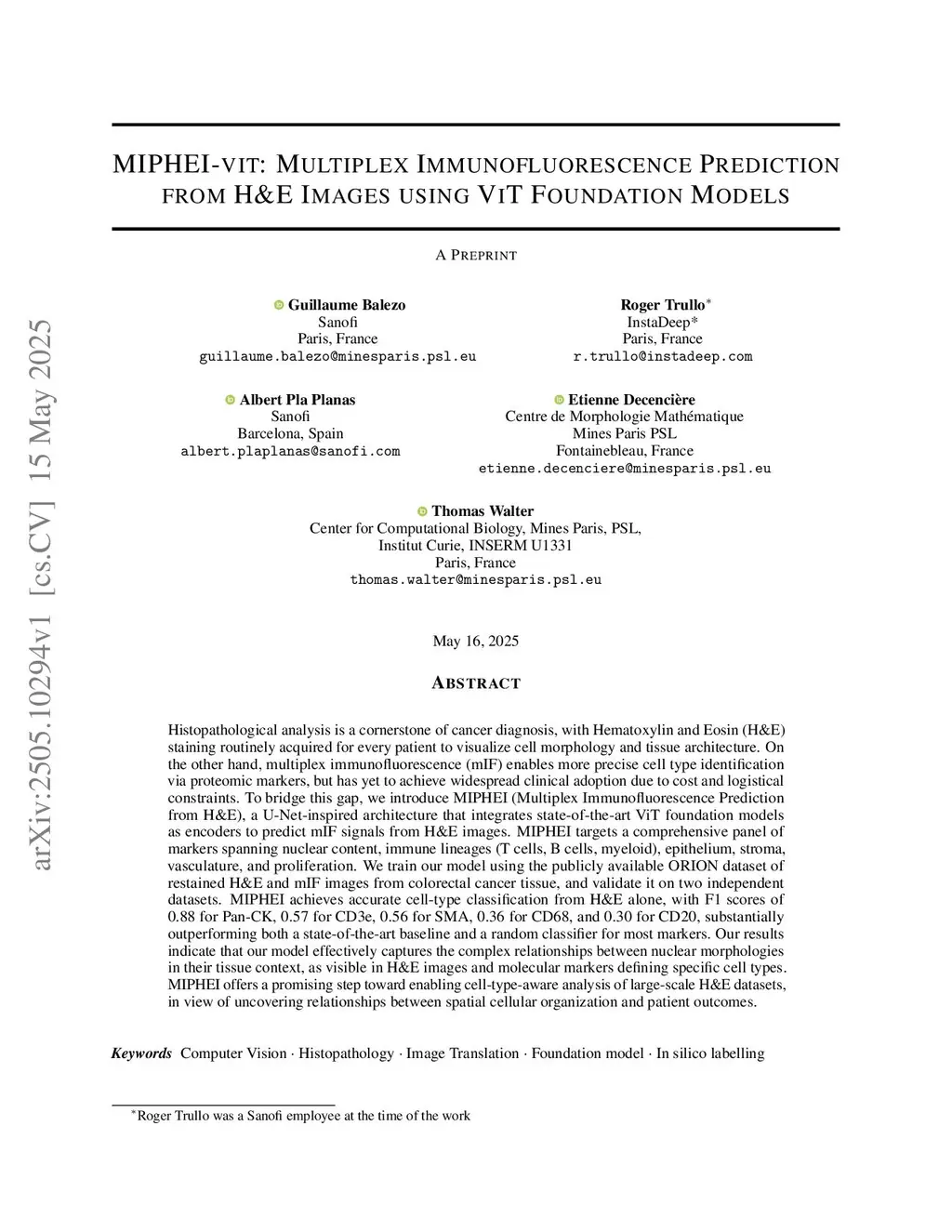 Histopathological analysis is a cornerstone of cancer diagnosis, with Hematoxylin and Eosin (H&E) staining routinely acquired for every patient to visualize cell morphology and tissue architecture. On the other hand, multiplex immunofluorescence (mIF) enables more precise cell type identification via proteomic markers, but has yet to achieve widespread clinical adoption due to cost and logistical constraints. To bridge this gap, we introduce MIPHEI (Multiplex Immunofluorescence Prediction from H&E), a U-Net-inspired architecture that integrates state-of-the-art ViT foundation models as encoders to predict mIF signals from H&E images. MIPHEI targets a comprehensive panel of markers spanning nuclear content, immune lineages (T cells, B cells, myeloid), epithelium, stroma, vasculature, and proliferation. We train our model using the publicly available ORION dataset of restained H&E and mIF images from colorectal cancer tissue, and validate it on two independent datasets. MIPHEI achieves accurate cell-type classification from H&E alone, with F1 scores of 0.88 for Pan-CK, 0.57 for CD3e, 0.56 for SMA, 0.36 for CD68, and 0.30 for CD20, substantially outperforming both a state-of-the-art baseline and a random classifier for most markers. Our results indicate that our model effectively captures the complex relationships between nuclear morphologies in their tissue context, as visible in H&E images and molecular markers defining specific cell types. MIPHEI offers a promising step toward enabling cell-type-aware analysis of large-scale H&E datasets, in view of uncovering relationships between spatial cellular organization and patient outcomes.