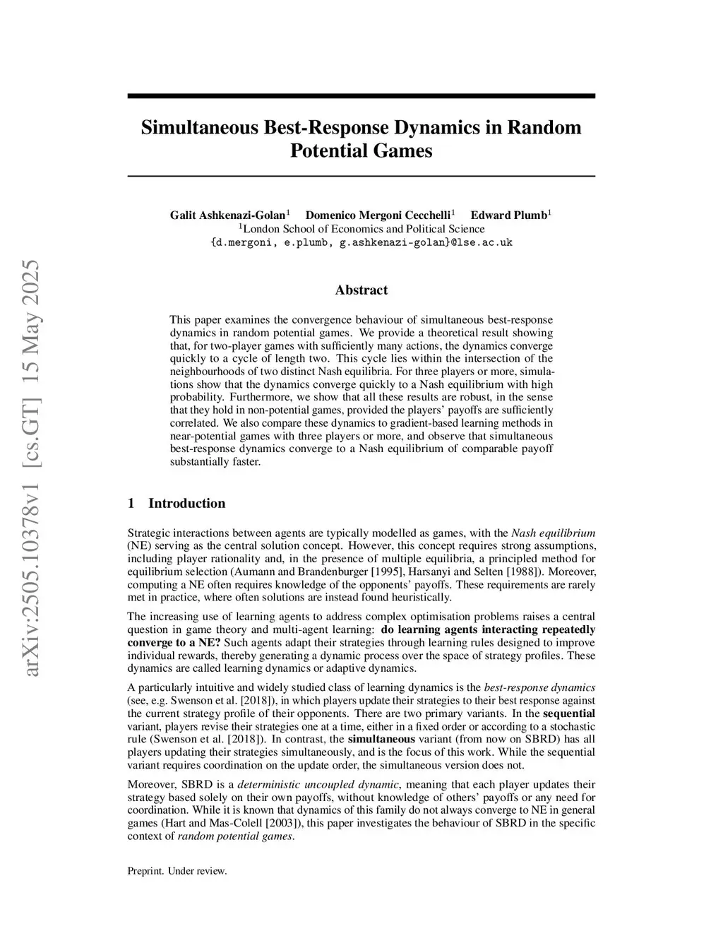 This paper examines the convergence behaviour of simultaneous best-response dynamics in random potential games. We provide a theoretical result showing that, for two-player games with sufficiently many actions, the dynamics converge quickly to a cycle of length two. This cycle lies within the intersection of the neighbourhoods of two distinct Nash equilibria. For three players or more, simulations show that the dynamics converge quickly to a Nash equilibrium with high probability. Furthermore, we show that all these results are robust, in the sense that they hold in non-potential games, provided the players' payoffs are sufficiently correlated. We also compare these dynamics to gradient-based learning methods in near-potential games with three players or more, and observe that simultaneous best-response dynamics converge to a Nash equilibrium of comparable payoff substantially faster.