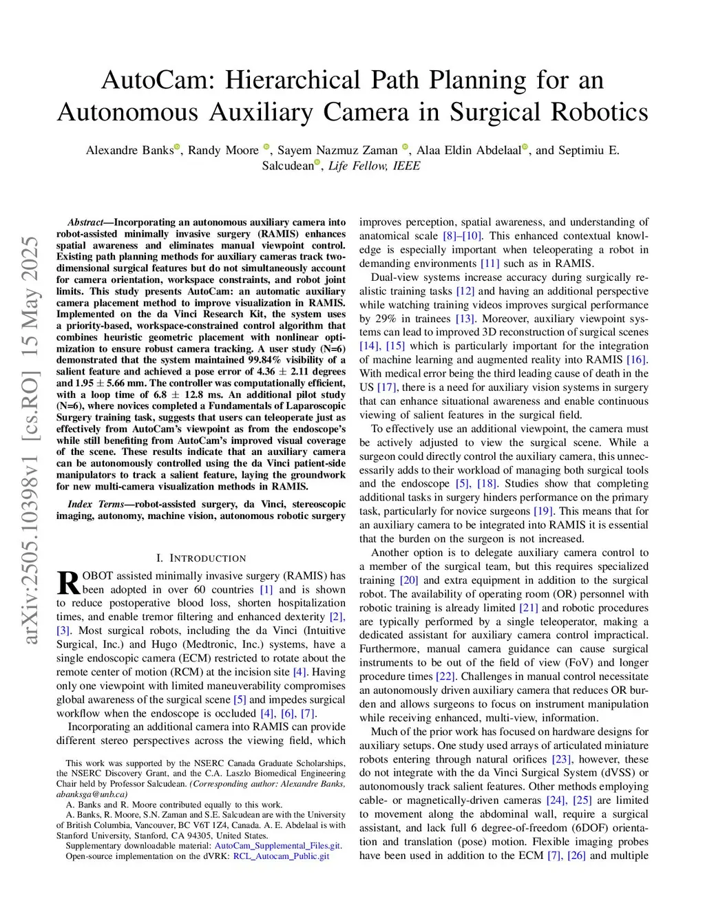 Incorporating an autonomous auxiliary camera into robot-assisted minimally invasive surgery (RAMIS) enhances spatial awareness and eliminates manual viewpoint control. Existing path planning methods for auxiliary cameras track two-dimensional surgical features but do not simultaneously account for camera orientation, workspace constraints, and robot joint limits. This study presents AutoCam: an automatic auxiliary camera placement method to improve visualization in RAMIS. Implemented on the da Vinci Research Kit, the system uses a priority-based, workspace-constrained control algorithm that combines heuristic geometric placement with nonlinear optimization to ensure robust camera tracking. A user study (N=6) demonstrated that the system maintained 99.84% visibility of a salient feature and achieved a pose error of 4.36 2.11 degrees and 1.95 5.66 mm. The controller was computationally efficient, with a loop time of 6.8 12.8 ms. An additional pilot study (N=6), where novices completed a Fundamentals of Laparoscopic Surgery training task, suggests that users can teleoperate just as effectively from AutoCam's viewpoint as from the endoscope's while still benefiting from AutoCam's improved visual coverage of the scene. These results indicate that an auxiliary camera can be autonomously controlled using the da Vinci patient-side manipulators to track a salient feature, laying the groundwork for new multi-camera visualization methods in RAMIS.