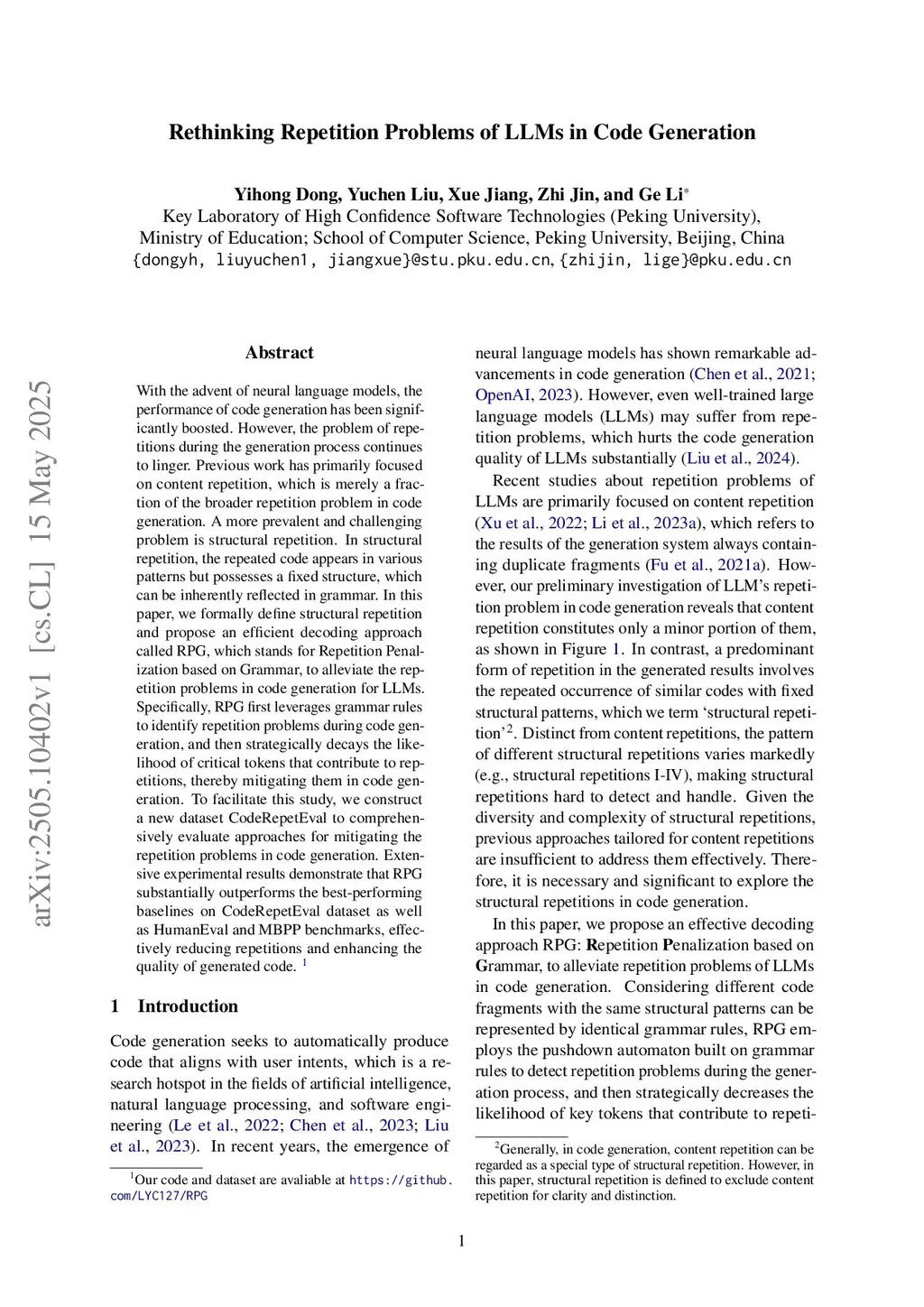 With the advent of neural language models, the performance of code generation has been significantly boosted. However, the problem of repetitions during the generation process continues to linger. Previous work has primarily focused on content repetition, which is merely a fraction of the broader repetition problem in code generation. A more prevalent and challenging problem is structural repetition. In structural repetition, the repeated code appears in various patterns but possesses a fixed structure, which can be inherently reflected in grammar. In this paper, we formally define structural repetition and propose an efficient decoding approach called RPG, which stands for Repetition Penalization based on Grammar, to alleviate the repetition problems in code generation for LLMs. Specifically, RPG first leverages grammar rules to identify repetition problems during code generation, and then strategically decays the likelihood of critical tokens that contribute to repetitions, thereby mitigating them in code generation. To facilitate this study, we construct a new dataset CodeRepetEval to comprehensively evaluate approaches for mitigating the repetition problems in code generation. Extensive experimental results demonstrate that RPG substantially outperforms the best-performing baselines on CodeRepetEval dataset as well as HumanEval and MBPP benchmarks, effectively reducing repetitions and enhancing the quality of generated code.