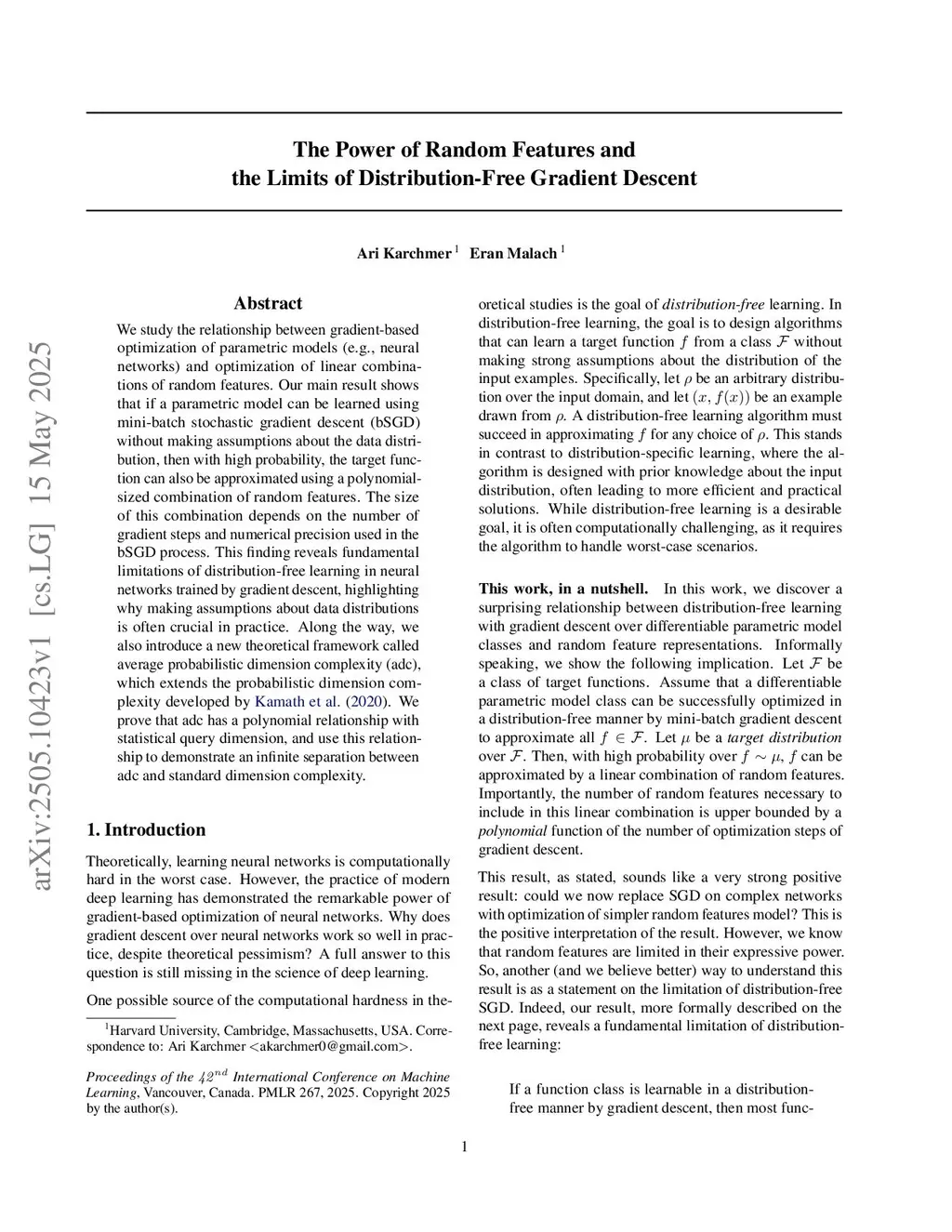 We study the relationship between gradient-based optimization of parametric models (e.g., neural networks) and optimization of linear combinations of random features. Our main result shows that if a parametric model can be learned using mini-batch stochastic gradient descent (bSGD) without making assumptions about the data distribution, then with high probability, the target function can also be approximated using a polynomial-sized combination of random features. The size of this combination depends on the number of gradient steps and numerical precision used in the bSGD process. This finding reveals fundamental limitations of distribution-free learning in neural networks trained by gradient descent, highlighting why making assumptions about data distributions is often crucial in practice. Along the way, we also introduce a new theoretical framework called average probabilistic dimension complexity (adc), which extends the probabilistic dimension complexity developed by Kamath et al. (2020). We prove that adc has a polynomial relationship with statistical query dimension, and use this relationship to demonstrate an infinite separation between adc and standard dimension complexity.