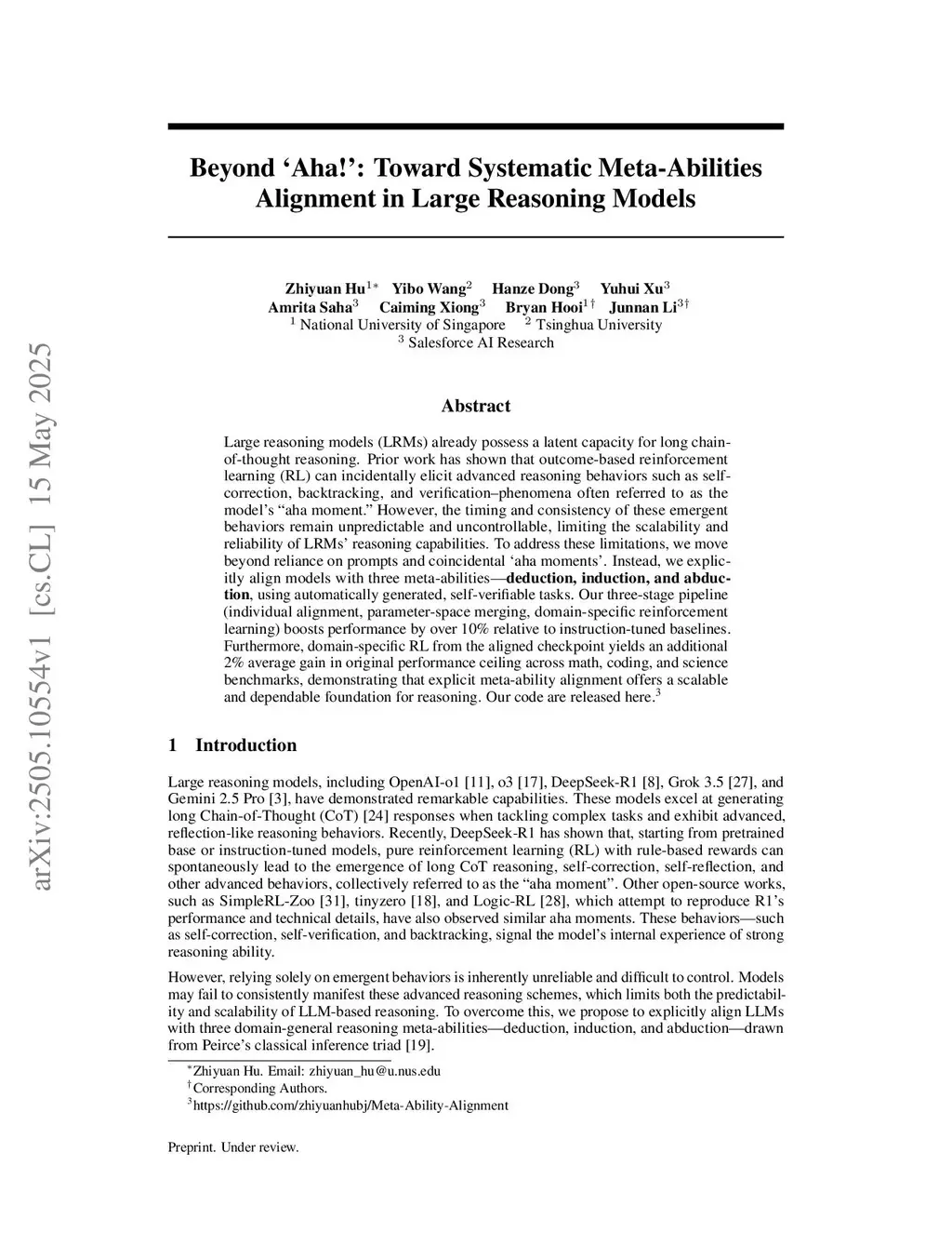 Large reasoning models (LRMs) already possess a latent capacity for long chain-of-thought reasoning. Prior work has shown that outcome-based reinforcement learning (RL) can incidentally elicit advanced reasoning behaviors such as self-correction, backtracking, and verification phenomena often referred to as the model's "aha moment". However, the timing and consistency of these emergent behaviors remain unpredictable and uncontrollable, limiting the scalability and reliability of LRMs' reasoning capabilities. To address these limitations, we move beyond reliance on prompts and coincidental "aha moments". Instead, we explicitly align models with three meta-abilities: deduction, induction, and abduction, using automatically generated, self-verifiable tasks. Our three stage-pipeline individual alignment, parameter-space merging, and domain-specific reinforcement learning, boosting performance by over 10\% relative to instruction-tuned baselines. Furthermore, domain-specific RL from the aligned checkpoint yields an additional gain in performance ceiling for both 7B and 32B models across math, coding, and science benchmarks, demonstrating that explicit meta-ability alignment offers a scalable and dependable foundation for reasoning. Code is available at:this https URL