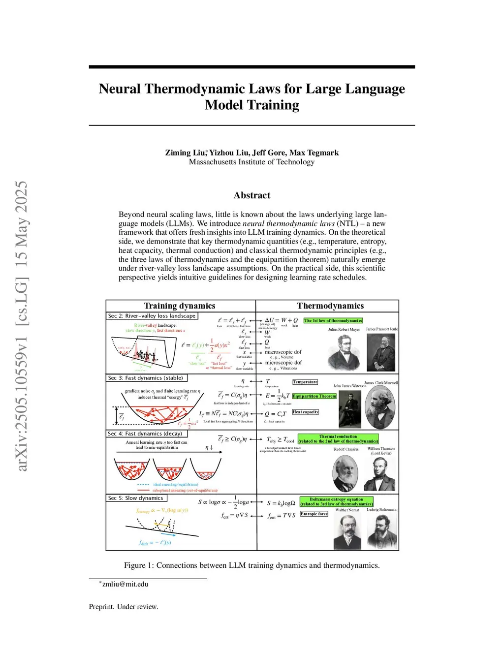 Beyond neural scaling laws, little is known about the laws underlying large language models (LLMs). We introduce Neural Thermodynamic Laws (NTL) -- a new framework that offers fresh insights into LLM training dynamics. On the theoretical side, we demonstrate that key thermodynamic quantities (e.g., temperature, entropy, heat capacity, thermal conduction) and classical thermodynamic principles (e.g., the three laws of thermodynamics and the equipartition theorem) naturally emerge under river-valley loss landscape assumptions. On the practical side, this scientific perspective yields intuitive guidelines for designing learning rate schedules.