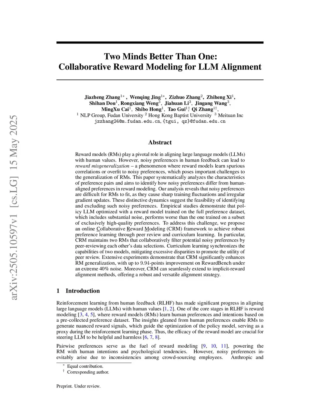 Reward models (RMs) play a pivotal role in aligning large language models (LLMs) with human values. However, noisy preferences in human feedback can lead to reward misgeneralization - a phenomenon where reward models learn spurious correlations or overfit to noisy preferences, which poses important challenges to the generalization of RMs. This paper systematically analyzes the characteristics of preference pairs and aims to identify how noisy preferences differ from human-aligned preferences in reward modeling. Our analysis reveals that noisy preferences are difficult for RMs to fit, as they cause sharp training fluctuations and irregular gradient updates. These distinctive dynamics suggest the feasibility of identifying and excluding such noisy preferences. Empirical studies demonstrate that policy LLM optimized with a reward model trained on the full preference dataset, which includes substantial noise, performs worse than the one trained on a subset of exclusively high quality preferences. To address this challenge, we propose an online Collaborative Reward Modeling (CRM) framework to achieve robust preference learning through peer review and curriculum learning. In particular, CRM maintains two RMs that collaboratively filter potential noisy preferences by peer-reviewing each other's data selections. Curriculum learning synchronizes the capabilities of two models, mitigating excessive disparities to promote the utility of peer review. Extensive experiments demonstrate that CRM significantly enhances RM generalization, with up to 9.94 points improvement on RewardBench under an extreme 40\% noise. Moreover, CRM can seamlessly extend to implicit-reward alignment methods, offering a robust and versatile alignment strategy.